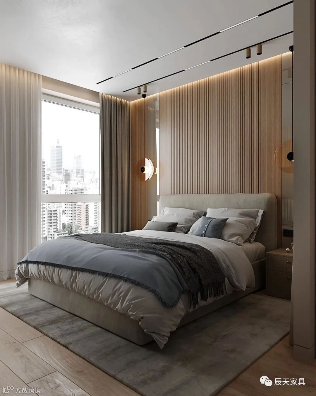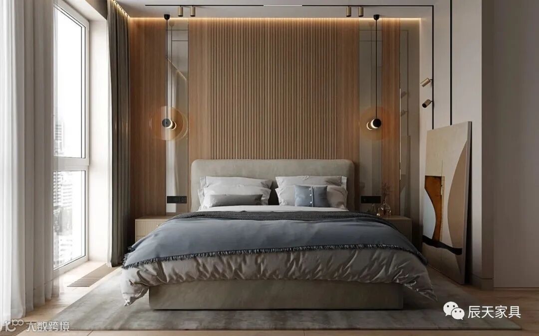 另一房间同样利用木色与高级灰的色调,散发的轻松感将一天的疲惫驱散,灰色的家纺增添了室内的安静感觉。