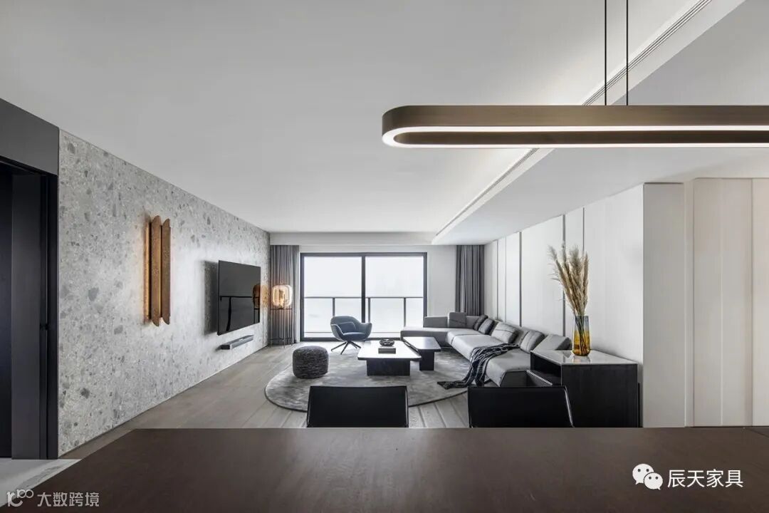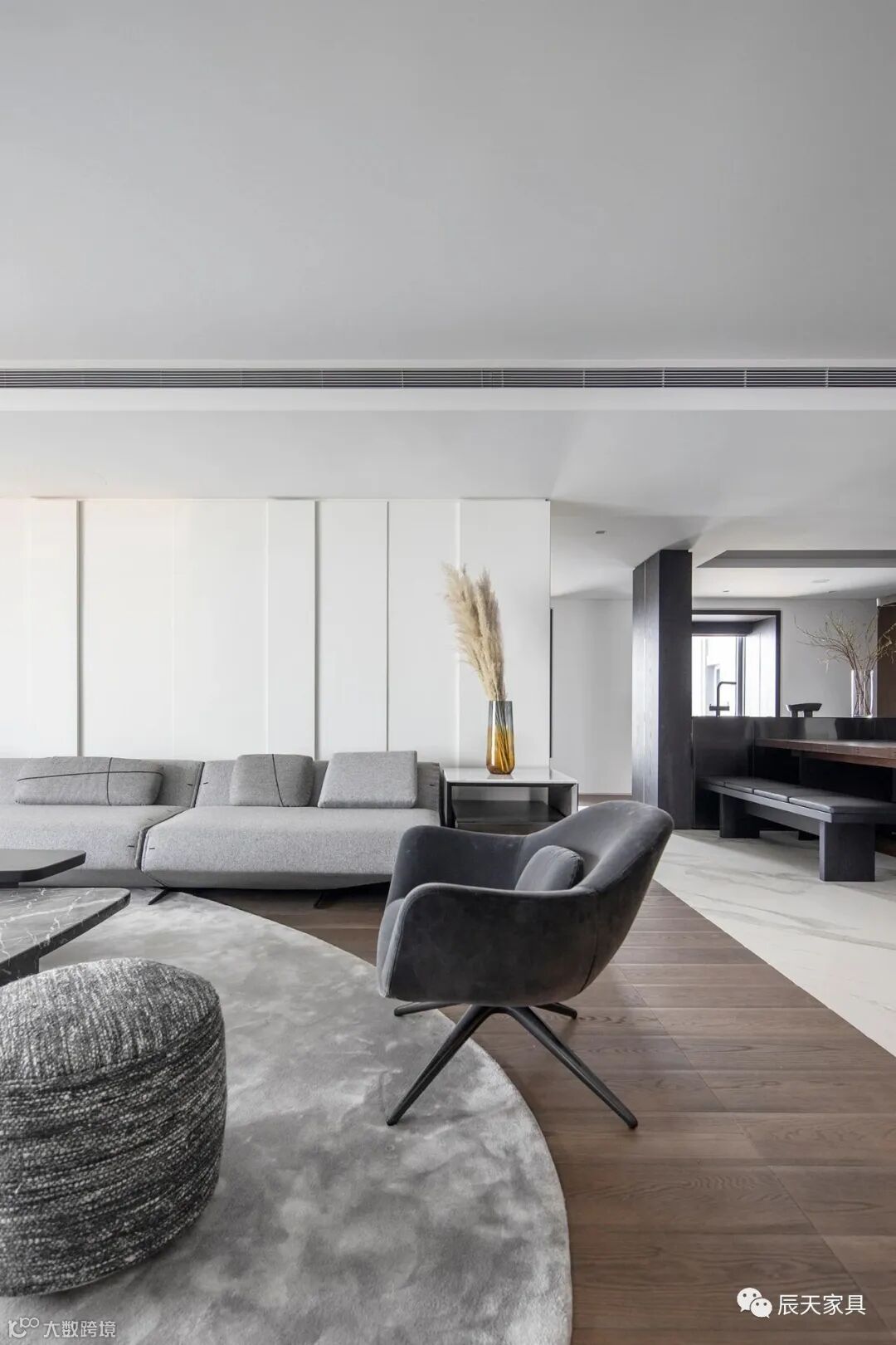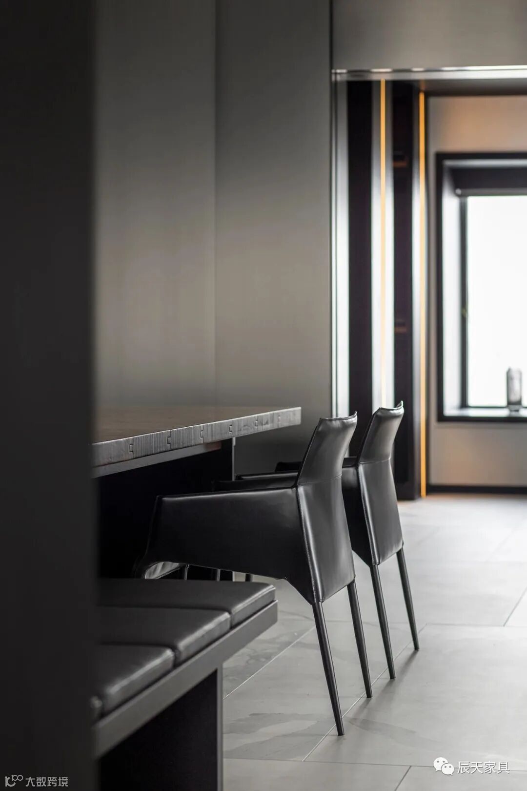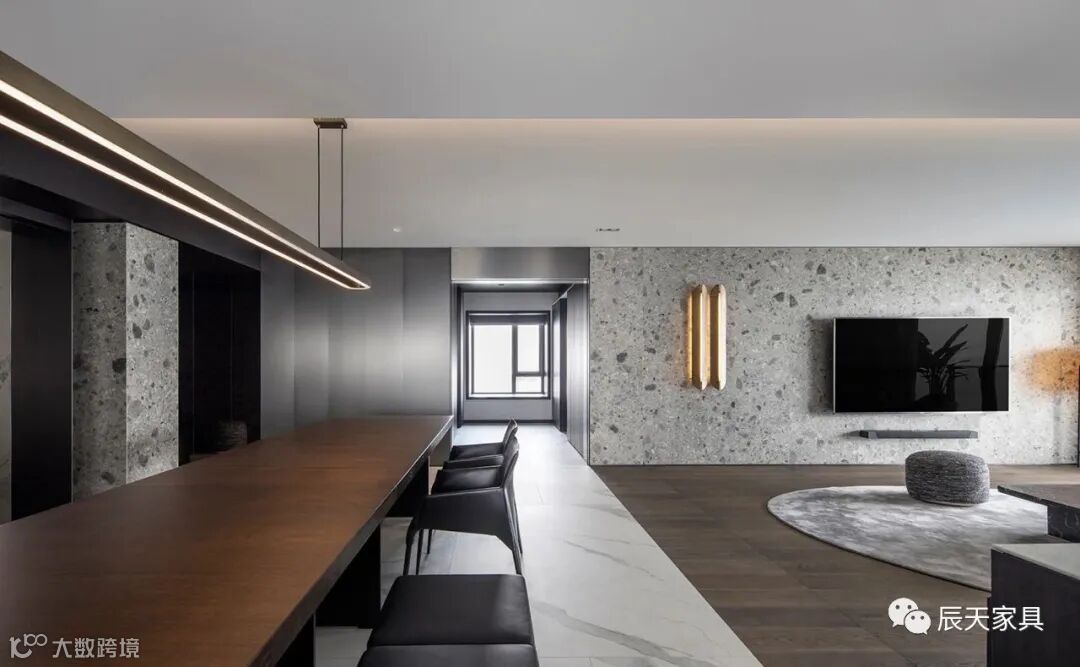 空间聚集点以中岛为轴,长桌为辅,打破客餐厅之交界,足温下材质的转变又不失场域的围塑感。