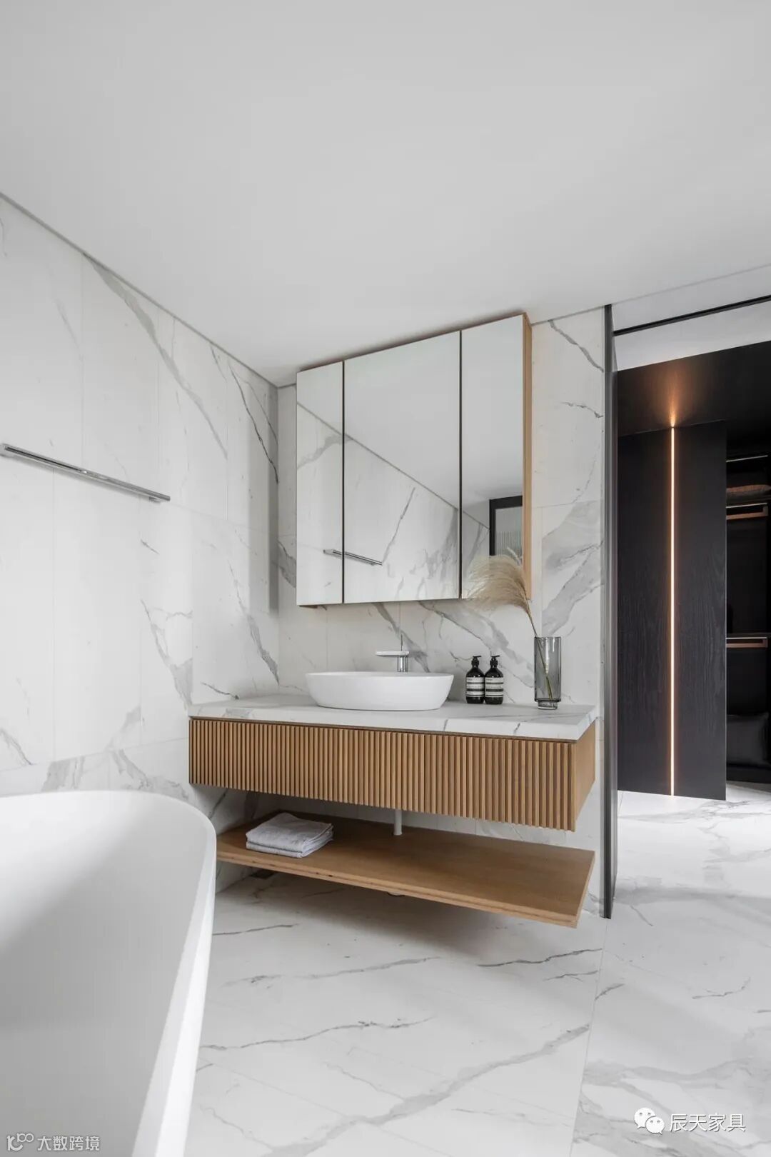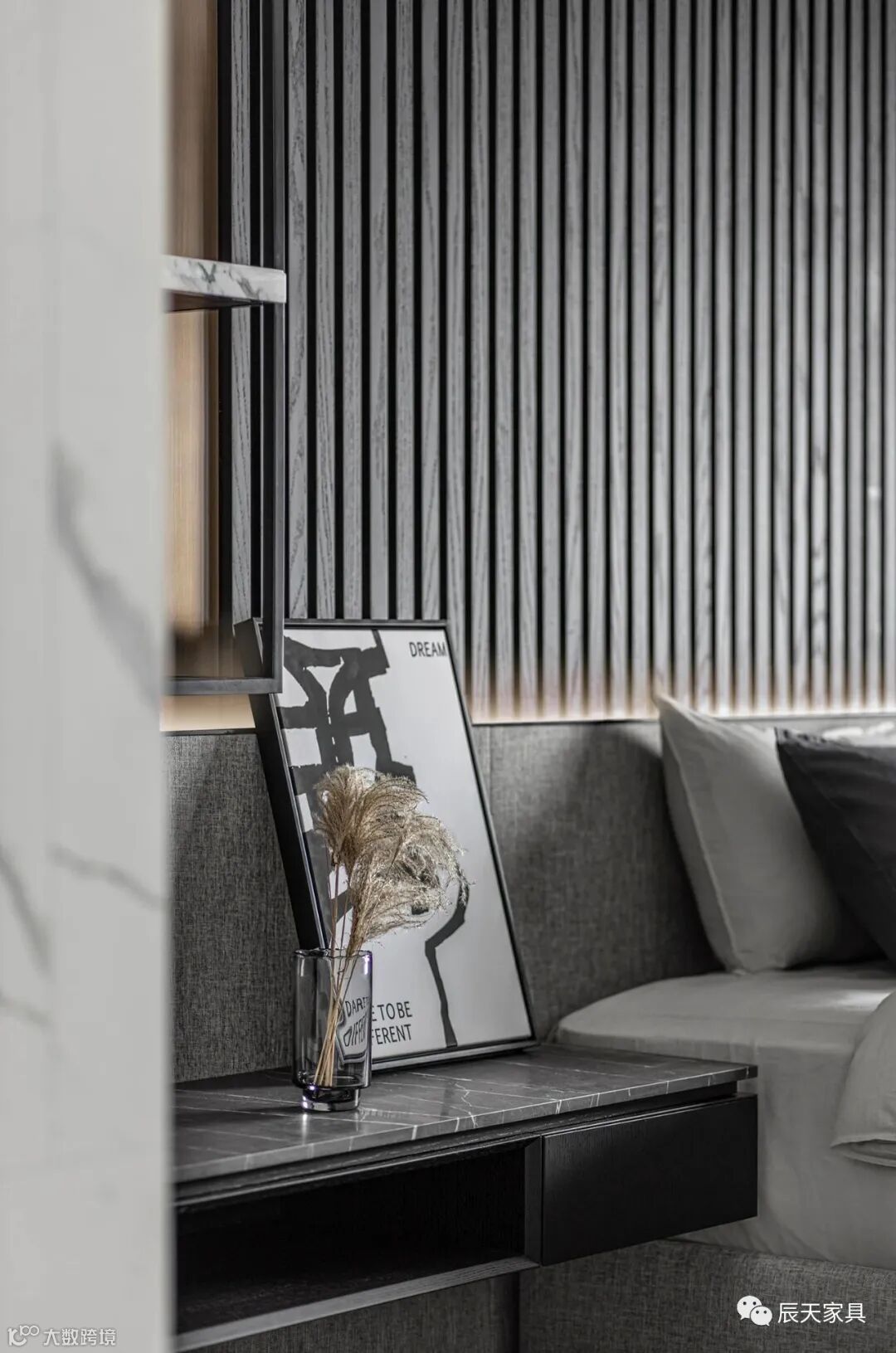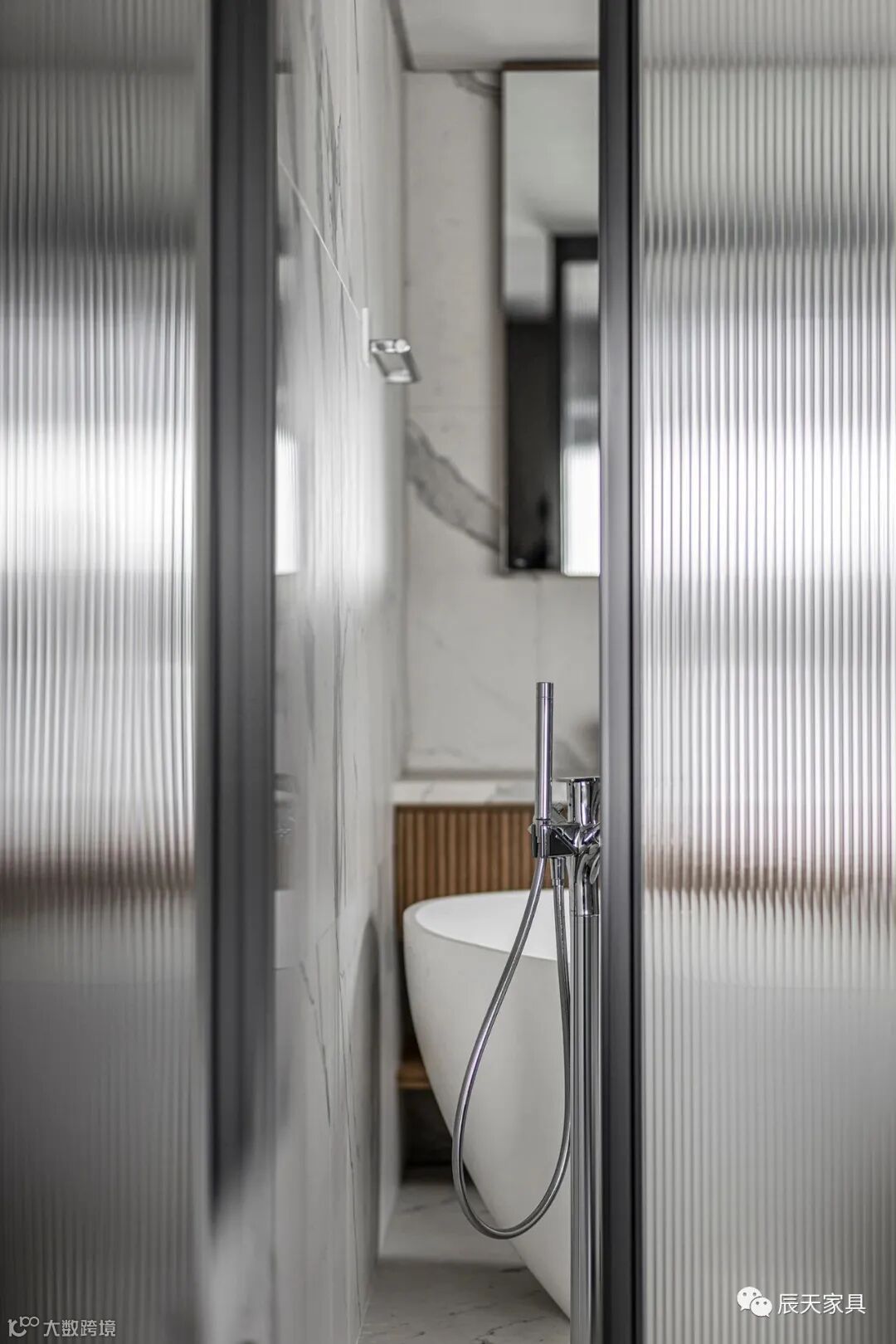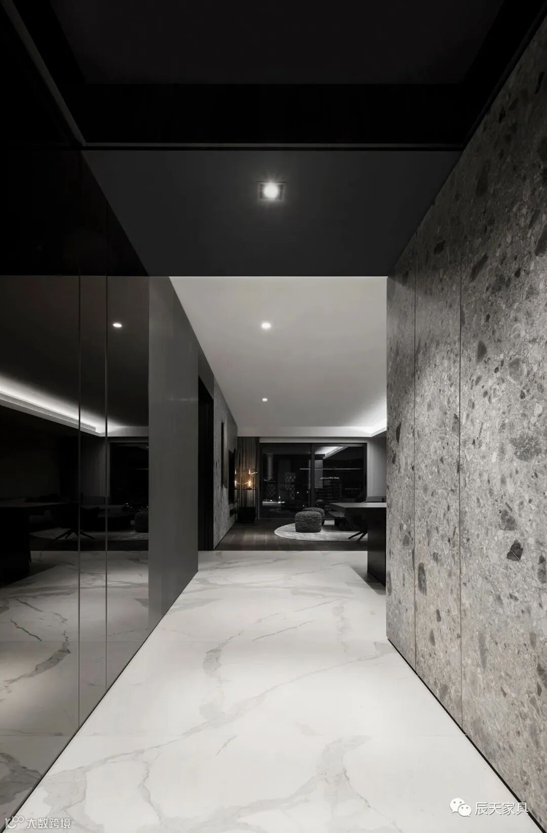 在纹理中利用错拼分割的律动,来传递石材原有的样貌,依不同比例切割墙面的进退面手法,来诠释量体在空间之内的堆叠,加上石材的肌理转折到天花的运用 ,木地板的温度延伸到壁面的手法,来呈现环境在空间的包覆性。