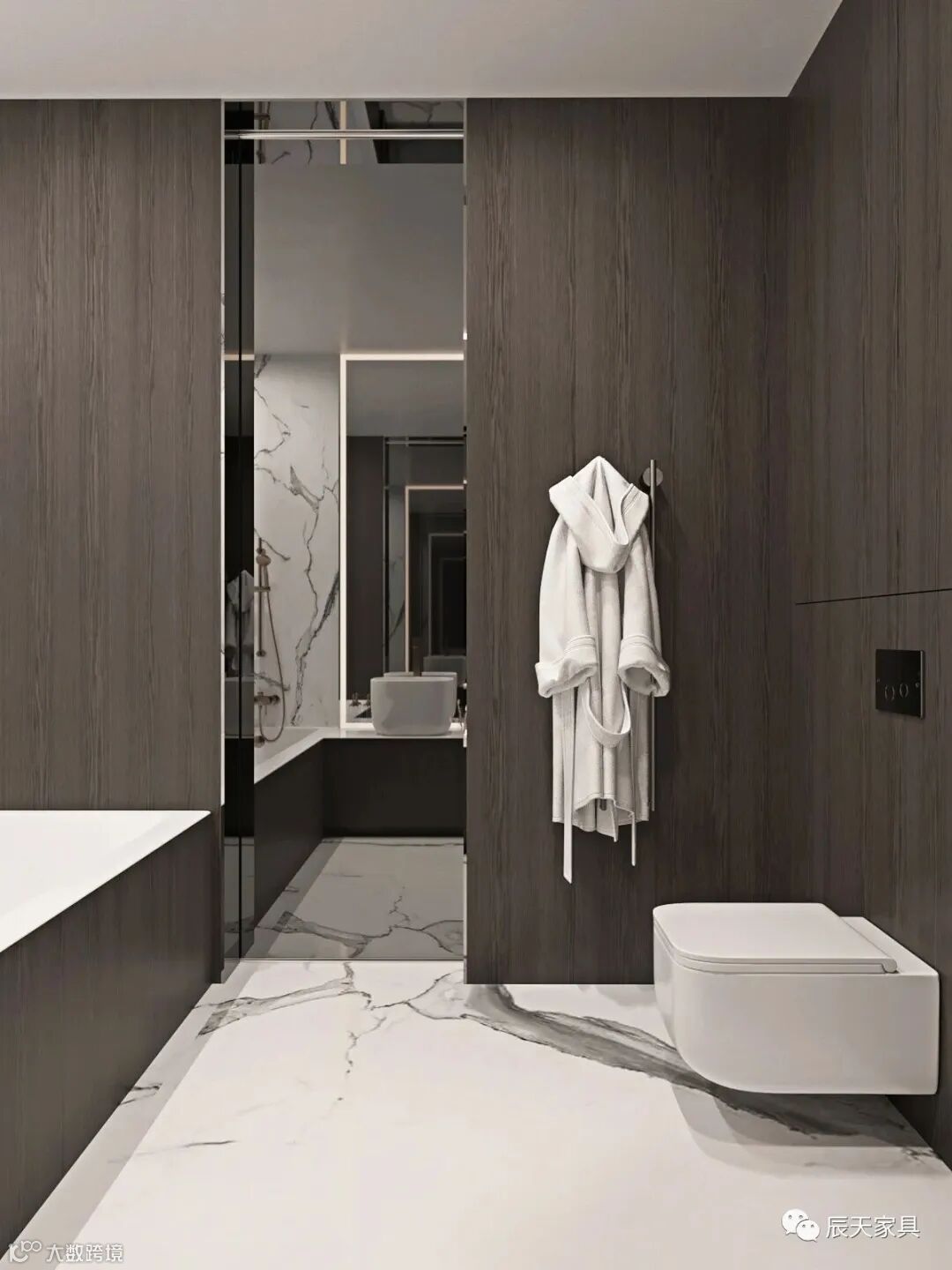卫生间以白色大理石和胡桃木搭配,