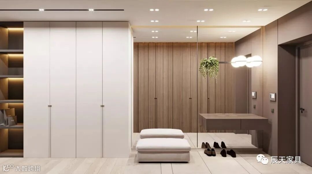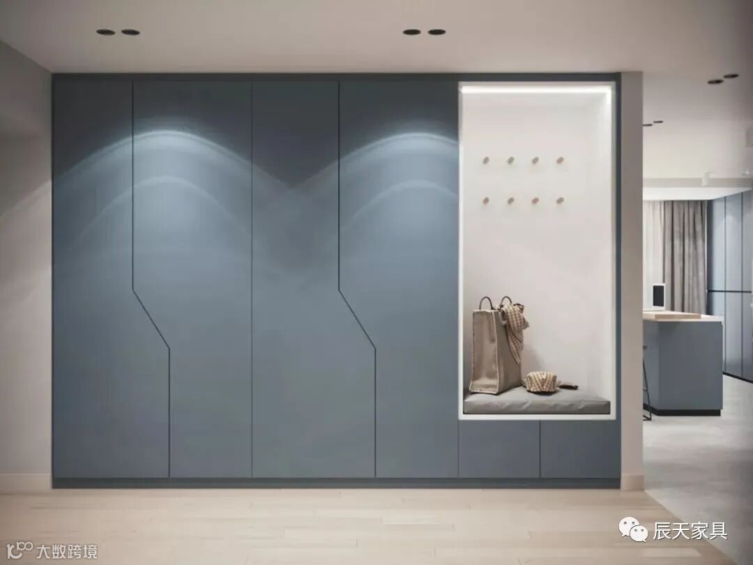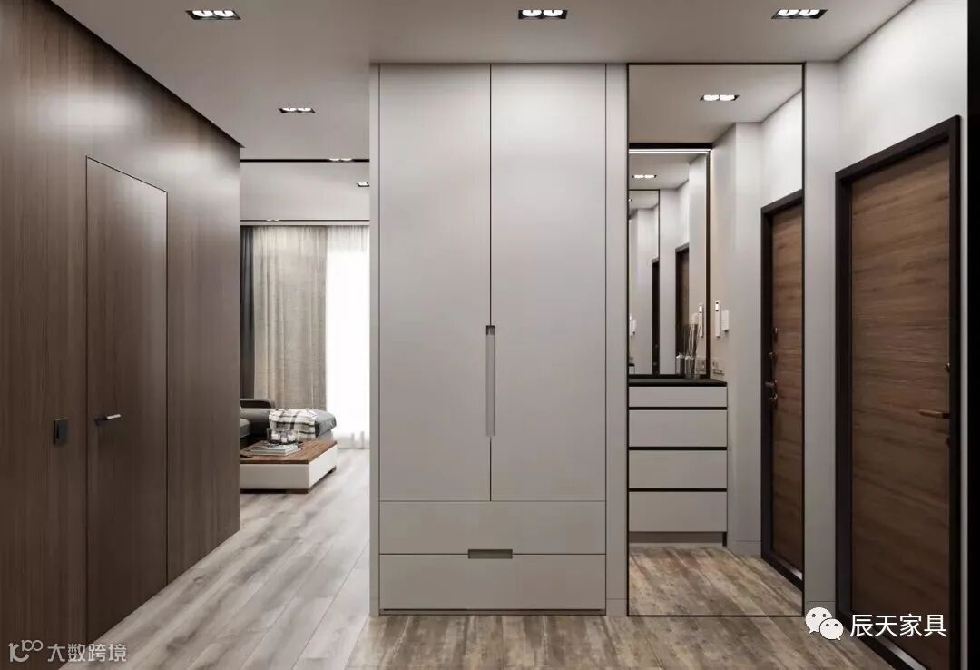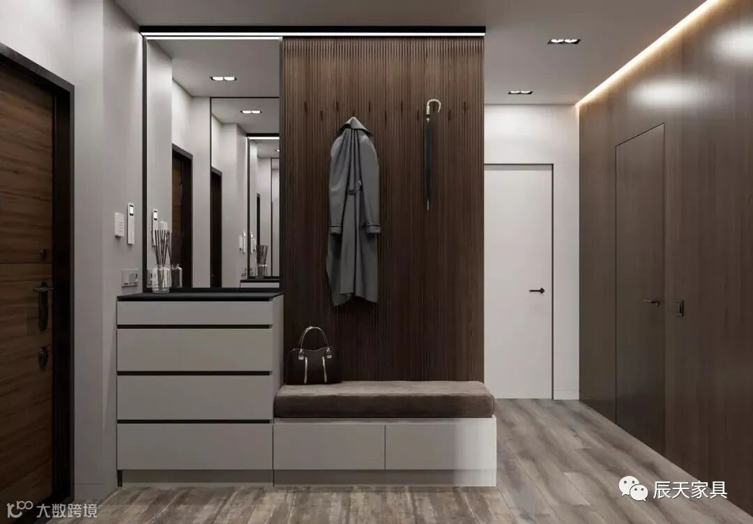如果自家的户型面积较大,可以设计一个大衣帽柜,包含鞋柜、挂衣、斗柜、雨伞、镜子、衣物收纳等衣帽柜。