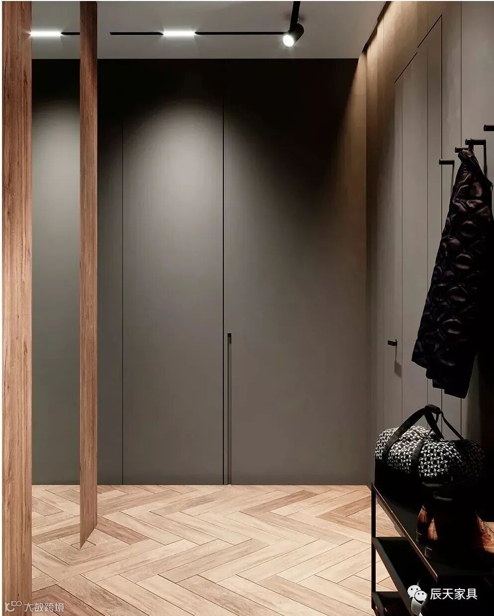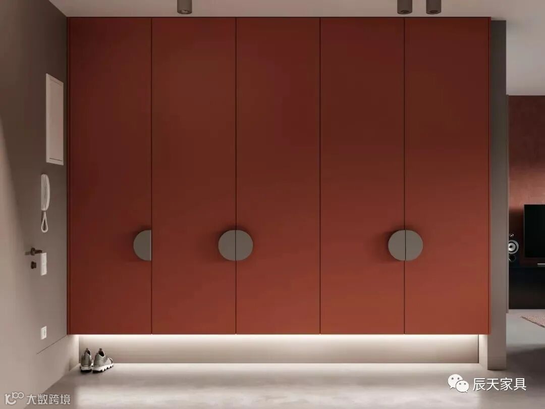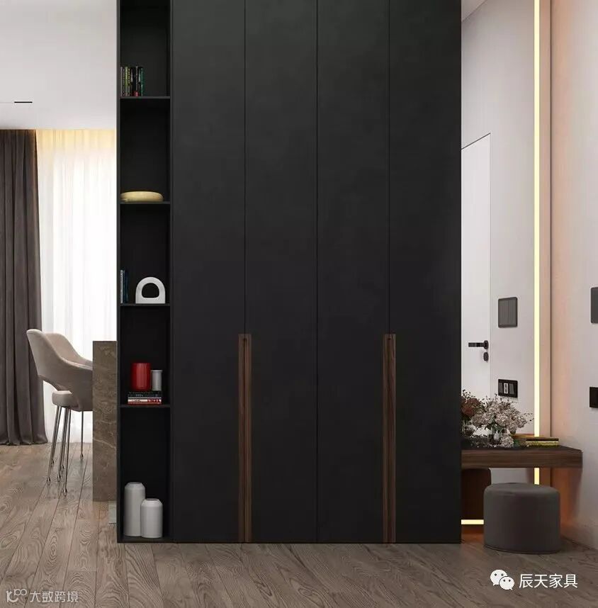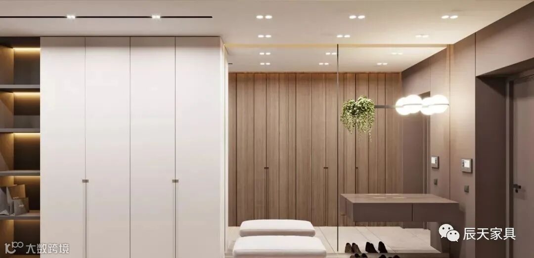 如果自家的户型面积较大,可以设计一个大衣帽柜,包含鞋柜、挂衣、斗柜、雨伞、镜子、衣物收纳等衣帽柜。