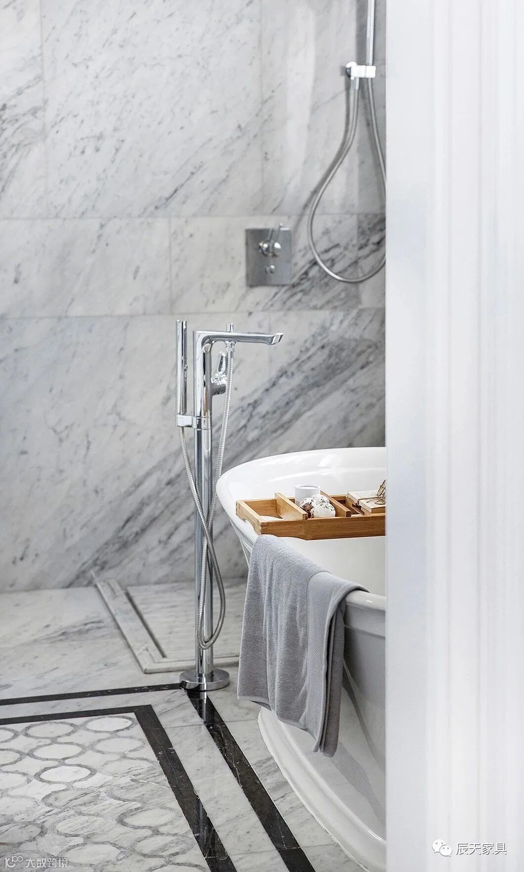 刻有凹槽的壁柱和壁龛无疑会唤起客人对奢华享受的实质憧憬,大量柔和的灰阶色在各个方面叠合,辅以豪华的材料色调 - 豪华的深色天鹅绒,白色大理石,古董黄铜,手工陶瓷,目之所及一气呵成,和平共处。