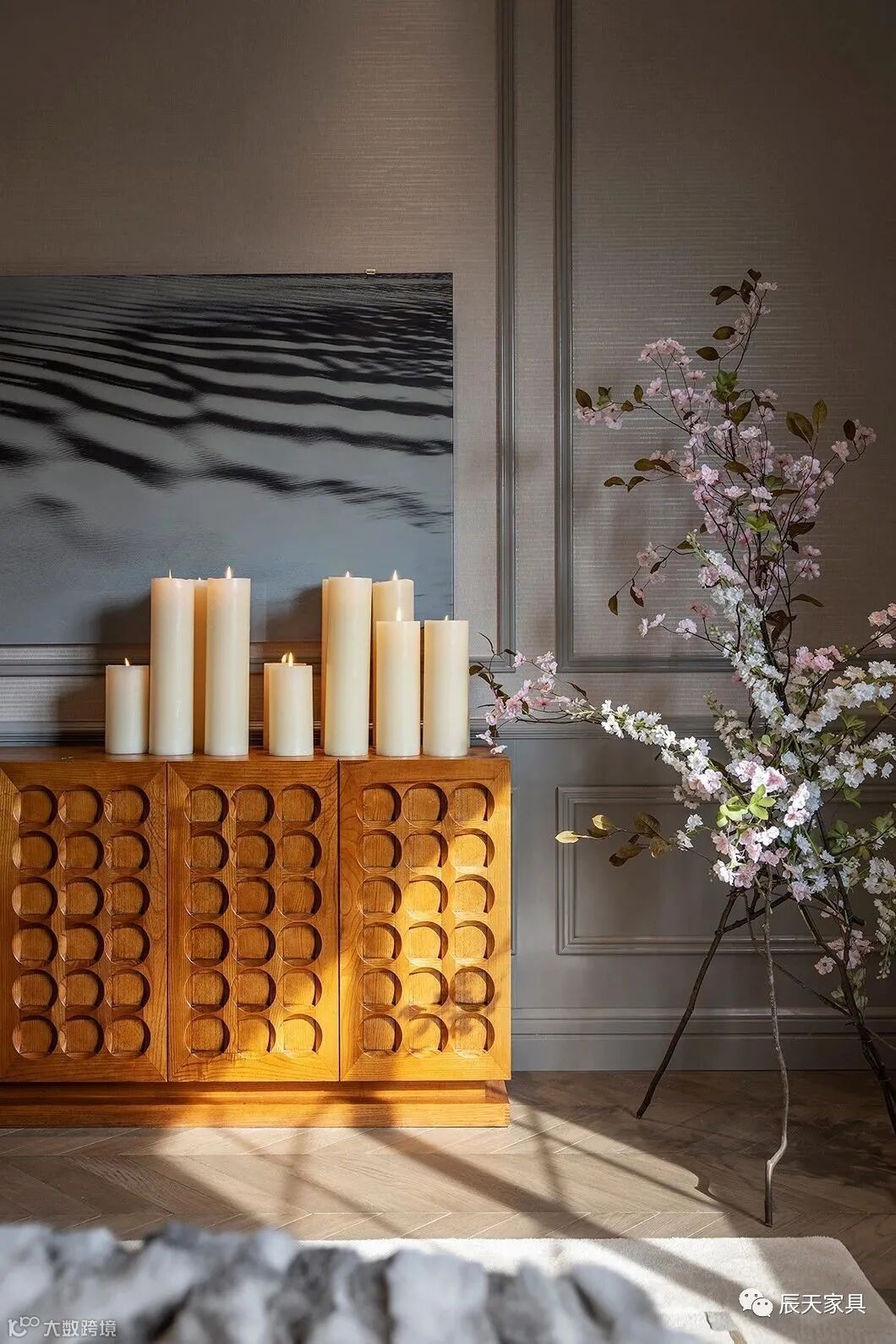 我们采用了明亮的木质边柜和樱花艺术品摆件,以现代的方式带来明媚春天感觉,在充斥着日光的日子里,让空间唤起宁静安逸的氛围。