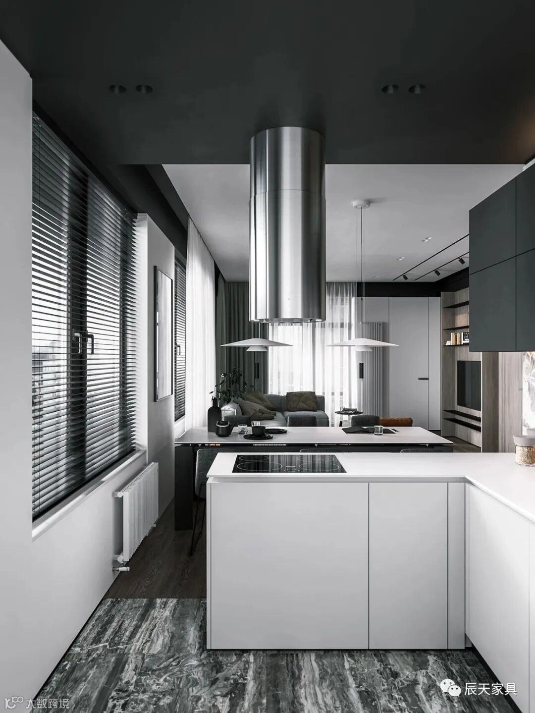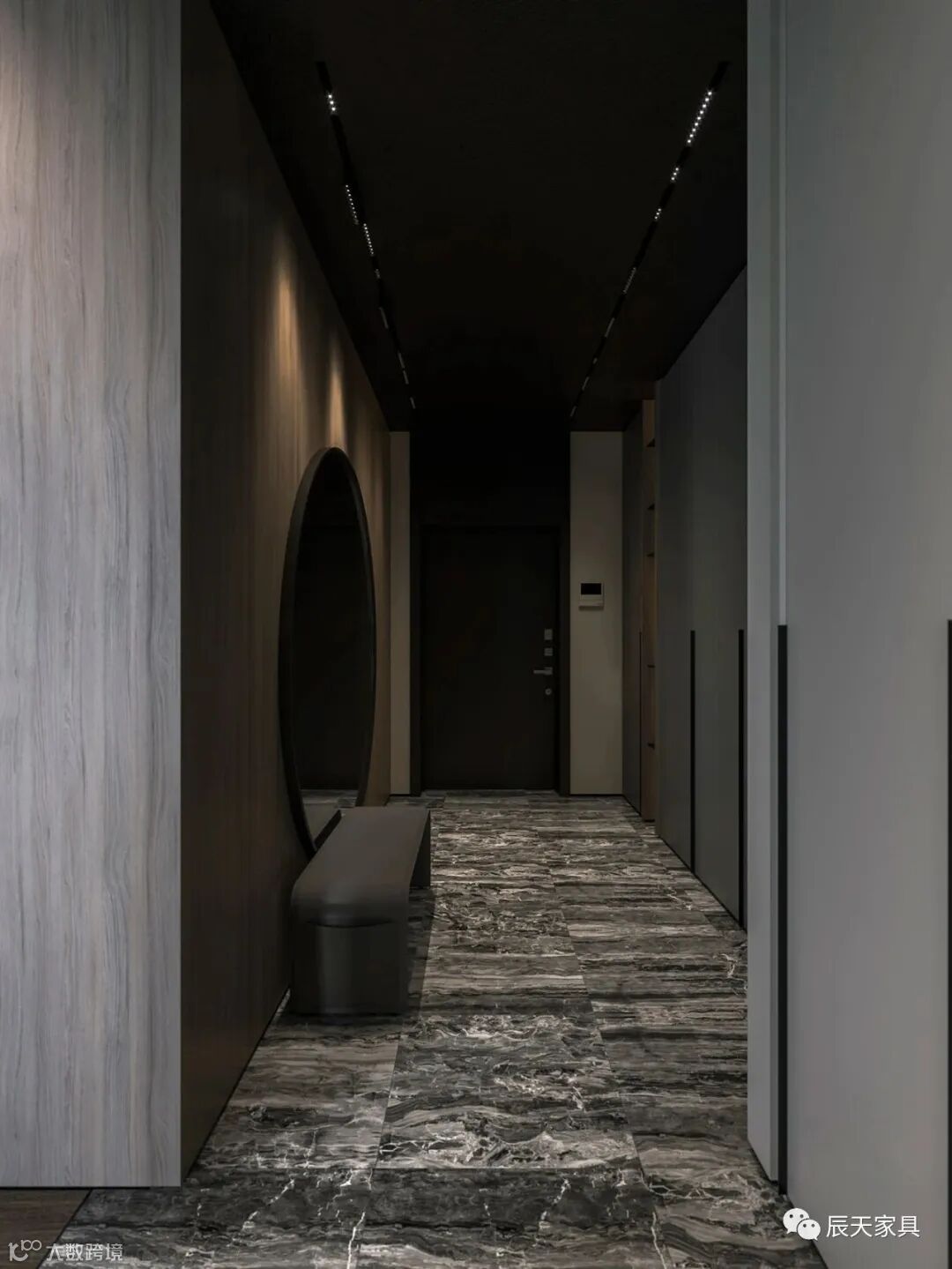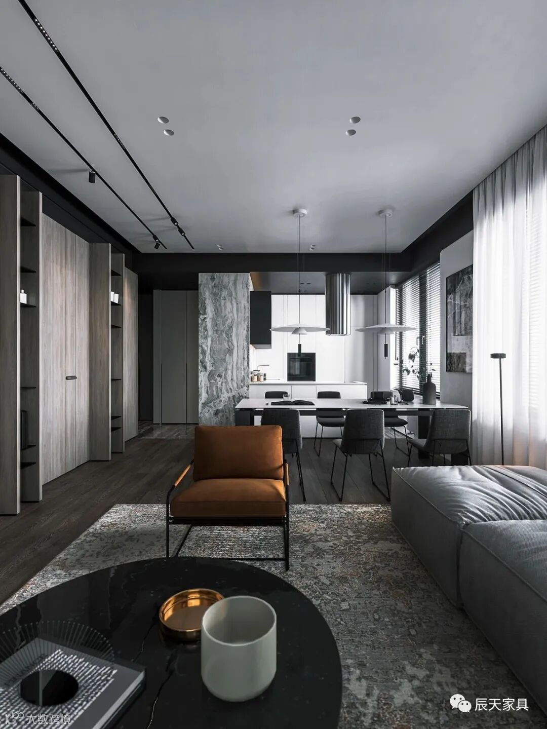 面积118平方米的高档住宅,精致的胡桃木墙板,嵌入式照明轨道和外围照明装置,豪华的黑色大理石体积以及高端家具构成了这种现代家居室内设计。厨房的设计与木墙面融合在一起,具有凝聚力的装饰主题贯穿主卧室和浴室,有效地将所有空间统一为一个自由流动的空间。