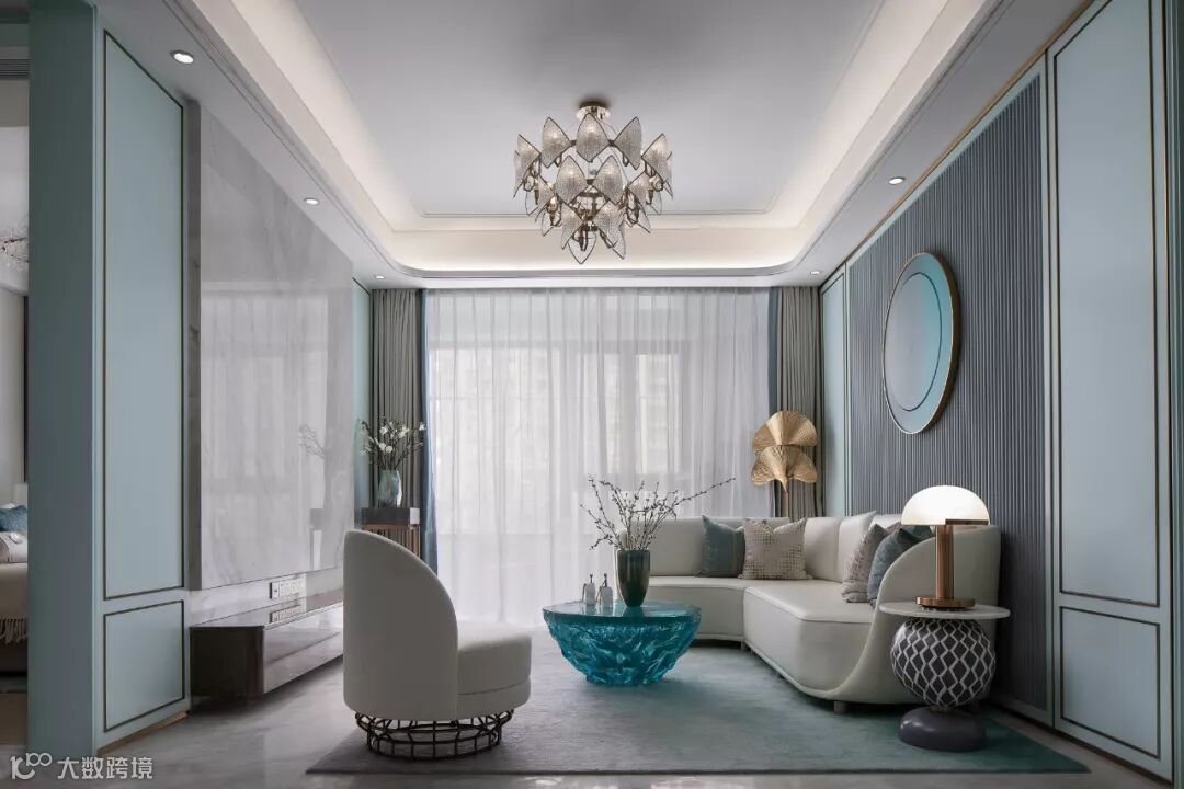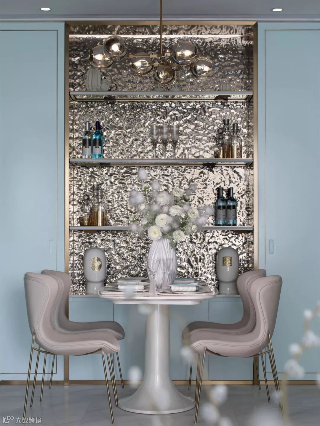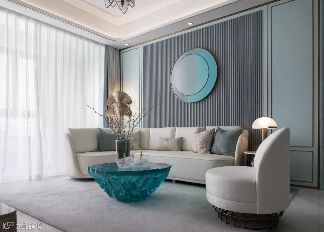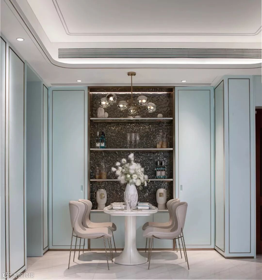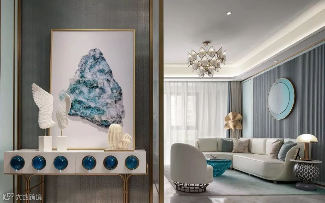 具有艺术感的花器与墙画迎合着蒂芙尼蓝