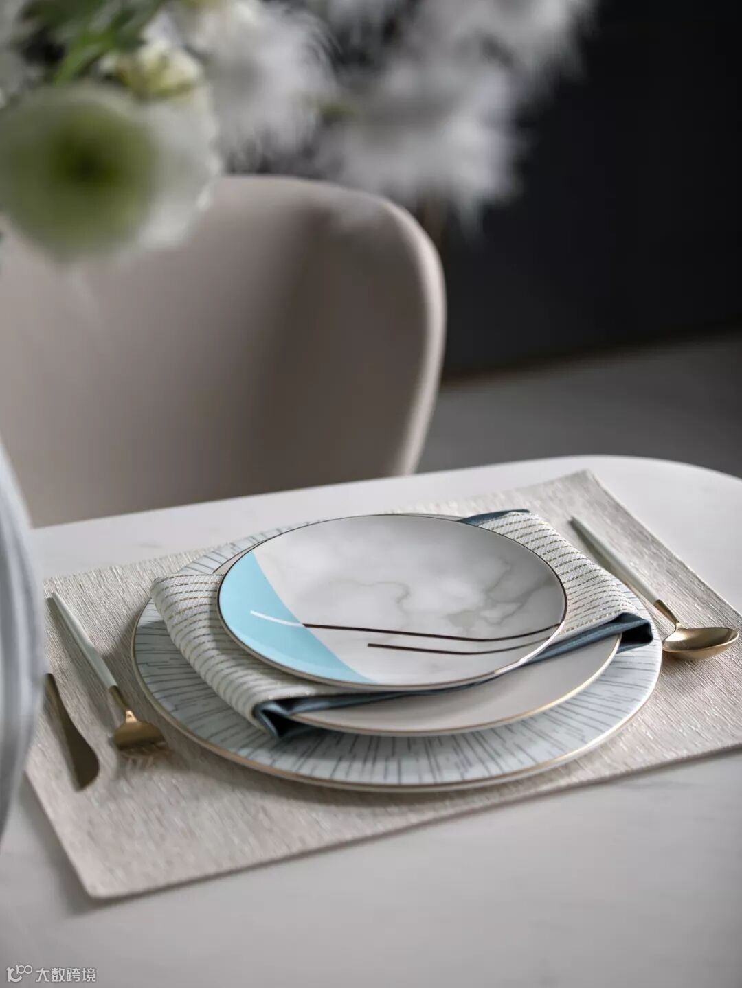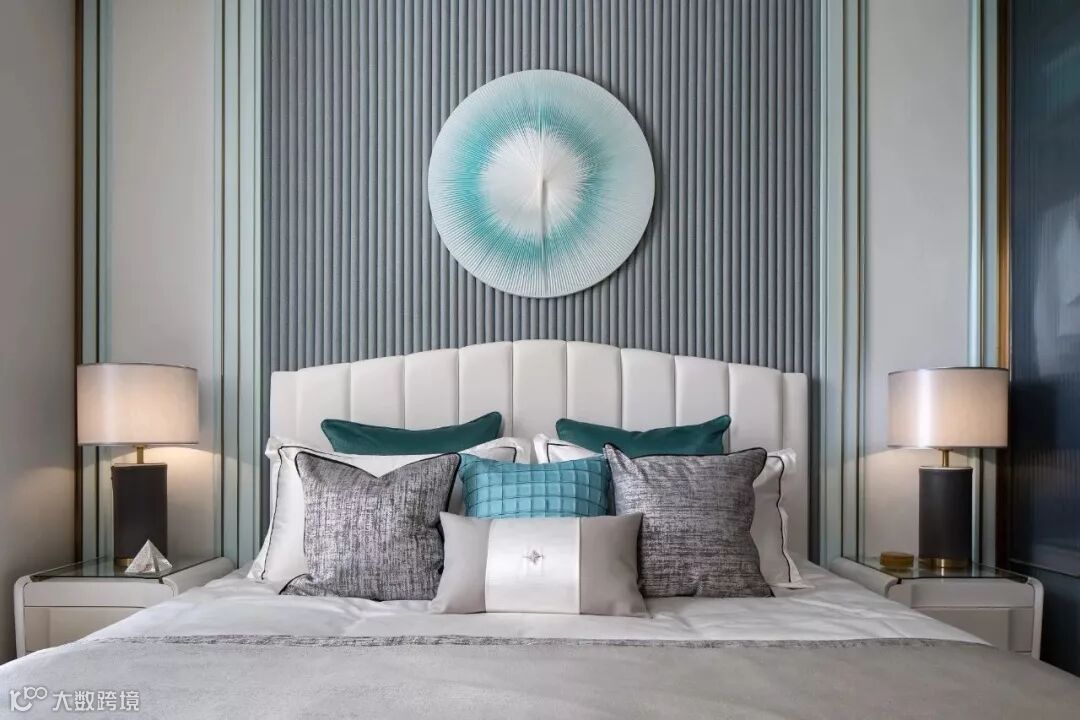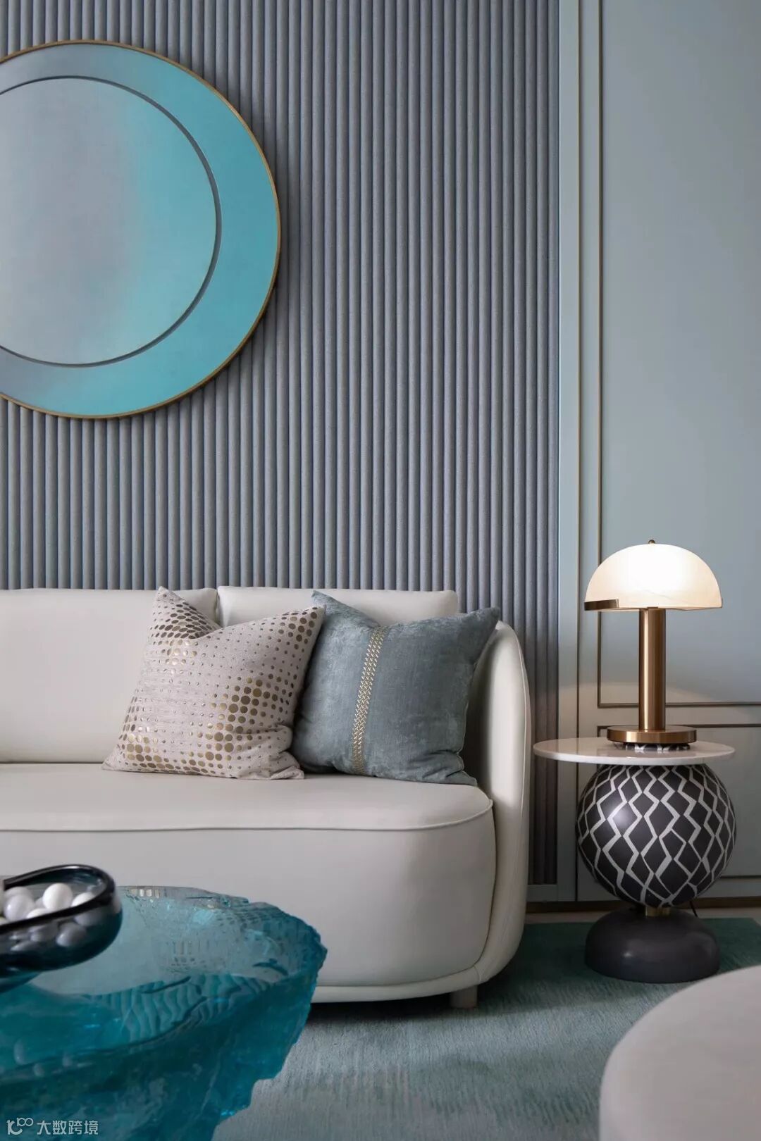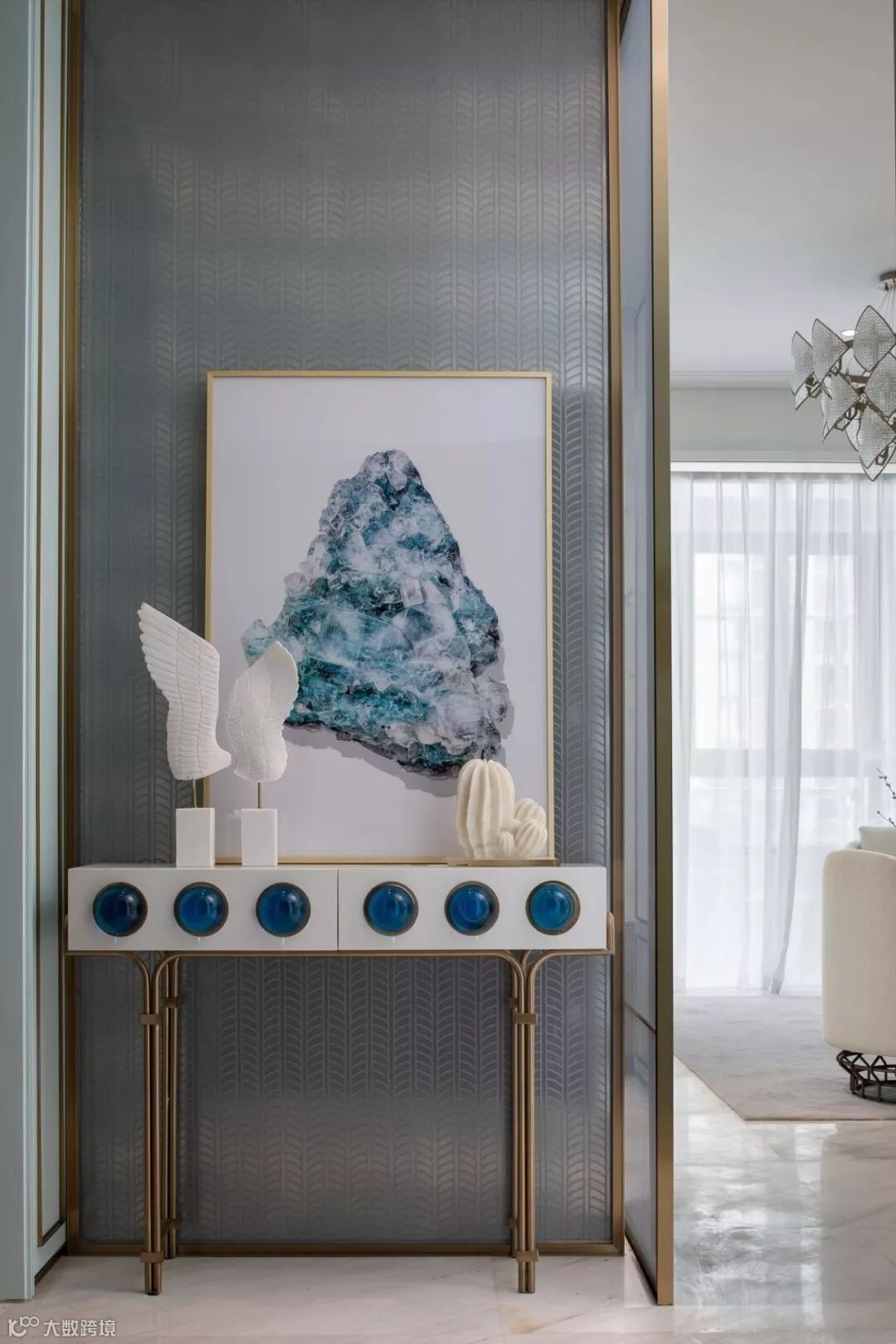 具有艺术感的花器与墙画迎合着蒂芙尼蓝