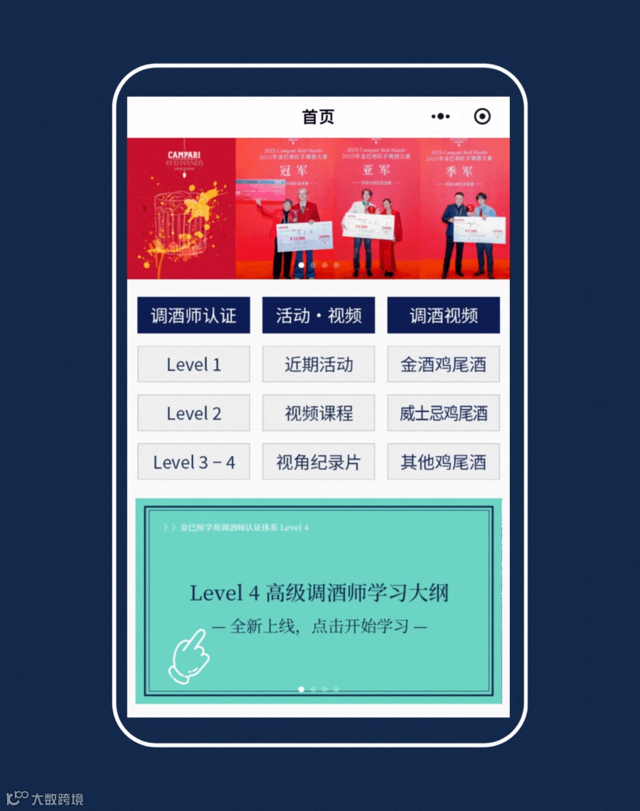 方法二:在金巴厘调酒师俱乐部小程序首页点击Level 3-4课程入口,或者点击首页中部“Level 4 高级调酒师学习大纲”图片进入学习: