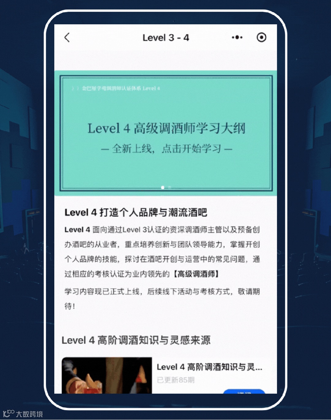 方法二:在金巴厘调酒师俱乐部小程序首页点击Level 3-4课程入口,或者点击首页中部“Level 4 高级调酒师学习大纲”图片进入学习:
