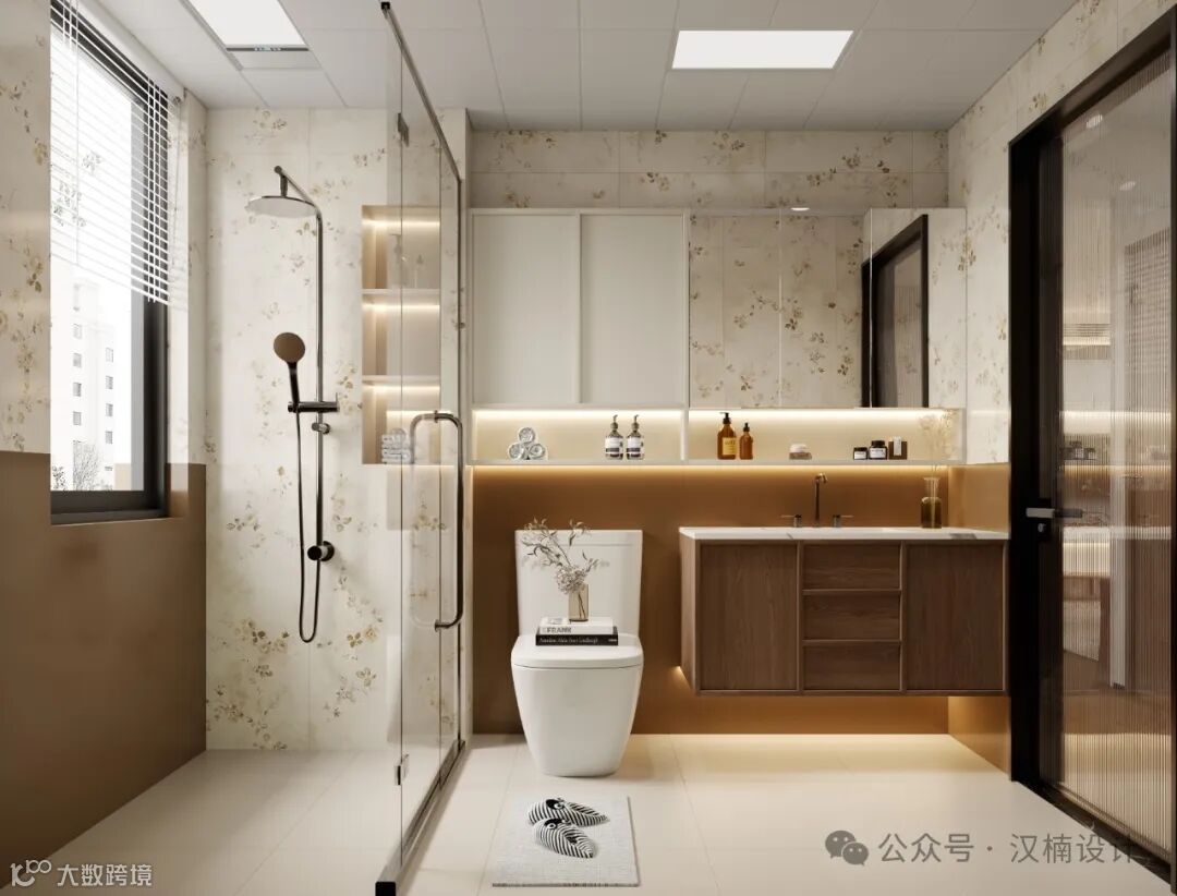 客卫也做了干湿分离,有一个单独的淋浴房。白色地砖搭配素雅的花砖,看上去简约而不简单。