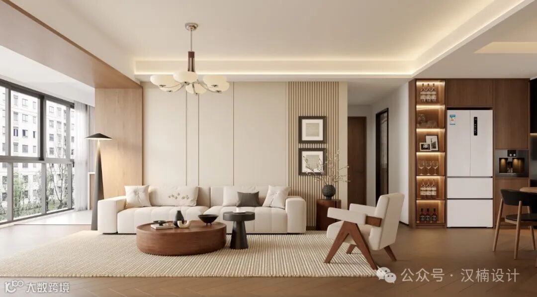 客厅的开间距离做了调整,分别向阳台和老人房区域扩展部分尺寸,使得客厅的横向纵向距离都在4米以上,视觉效果更加宽敞明亮。