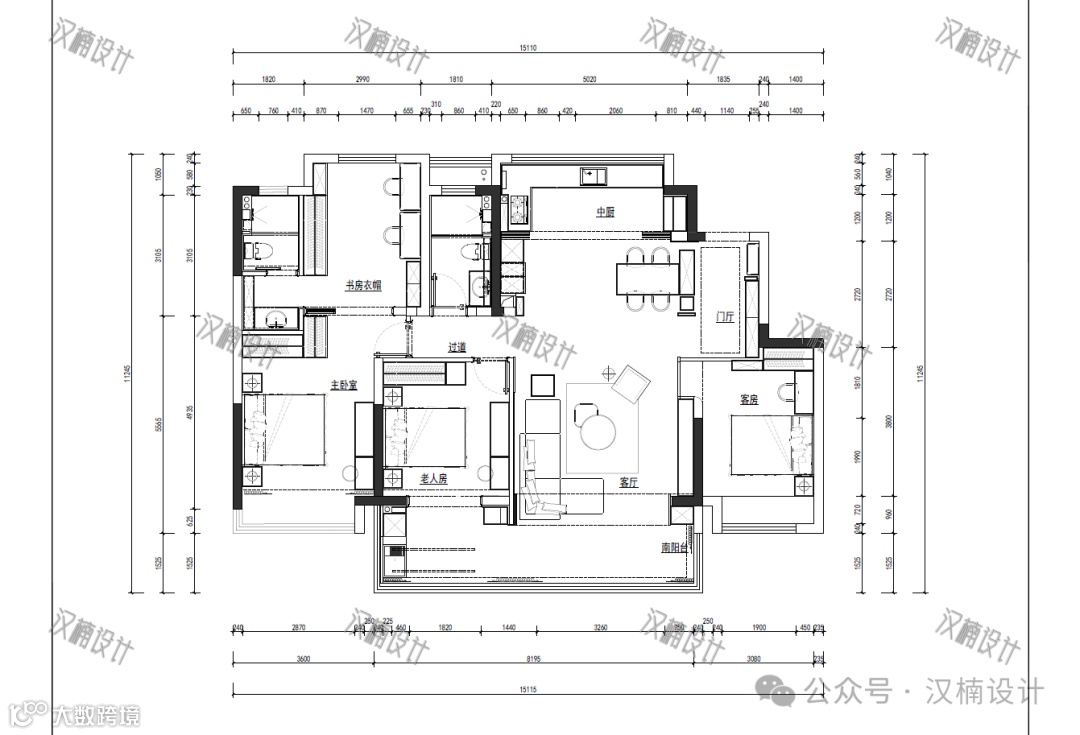 考虑到老人偶尔会过来居住,起居习惯可能会不同,老人房和主卧是两个不互扰的空间;晚上活动区域基本在书房、衣帽和主卧室的区域。