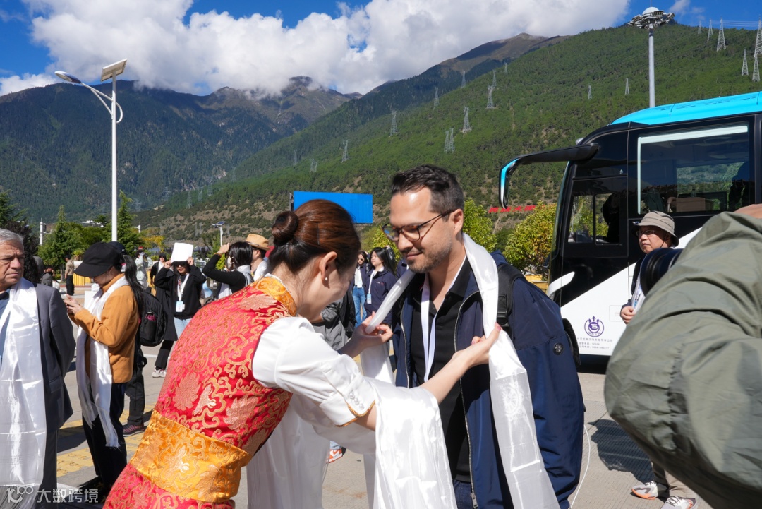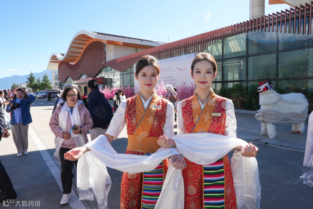 10时17分,航班平稳抵达林芝米林机场。每位嘉宾都受赠了象征着吉祥的洁白哈达。欢迎仪式上,牦牛舞热烈上演,两位舞者在激昂的鼓乐中腾跃舞动。精彩的舞蹈表演将活动氛围推向高潮,让国际客人们近距离感受林芝独特的文化魅力。