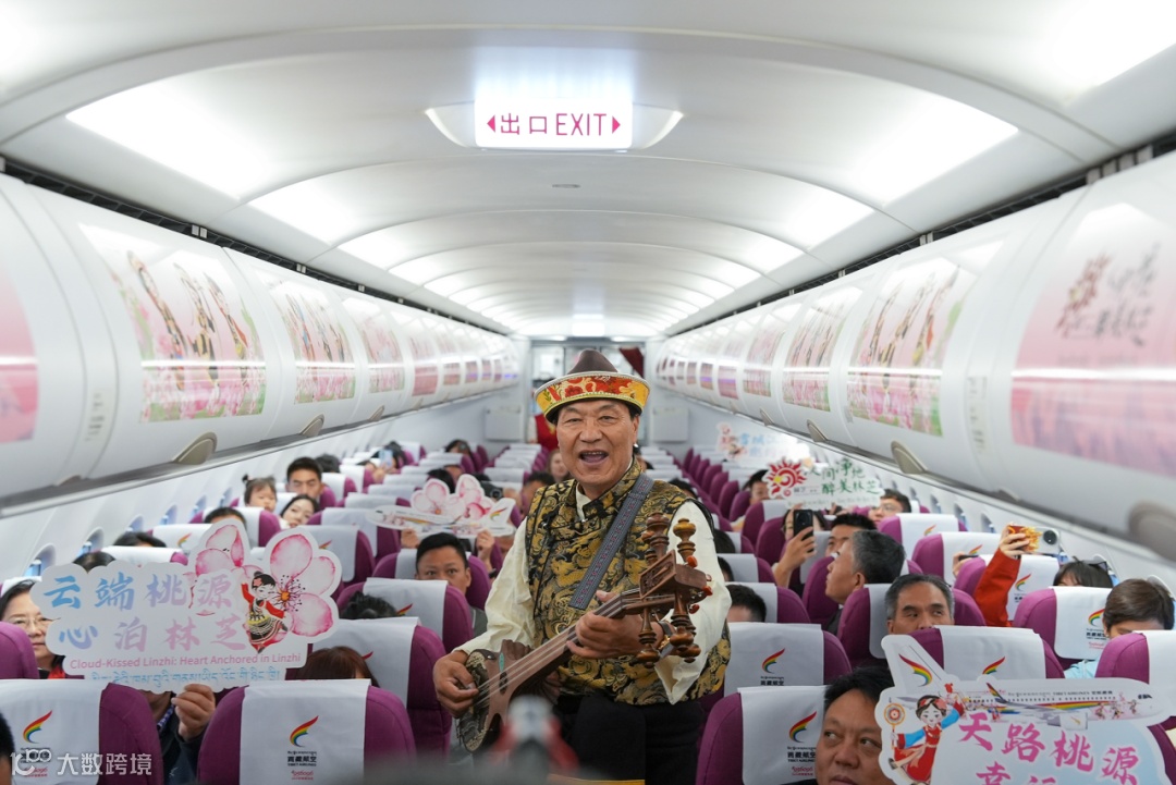 “女士们、先生们,欢迎乘坐西藏航空‘林芝文旅号’主题航班……”旅客自登机起便步入一幅生动的“林芝画卷”。南迦巴瓦峰的壮美、桃花谷的绚烂、鲁朗林海的静谧、雅鲁藏布大峡谷的雄奇,以及独具特色的非遗技艺,通过循环播放的风光片一一呈现,令人仿佛提前置身于雪域桃源。非遗传承人献唱工布民歌,悠然的扎念琴声进一步点燃了大家对林芝之行的期待。
