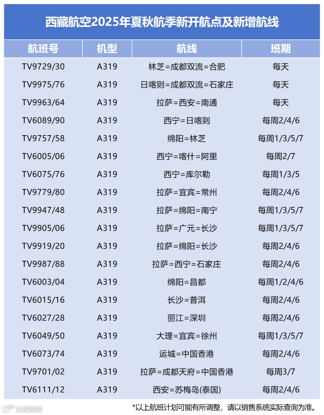 西藏航空将进行航班换季