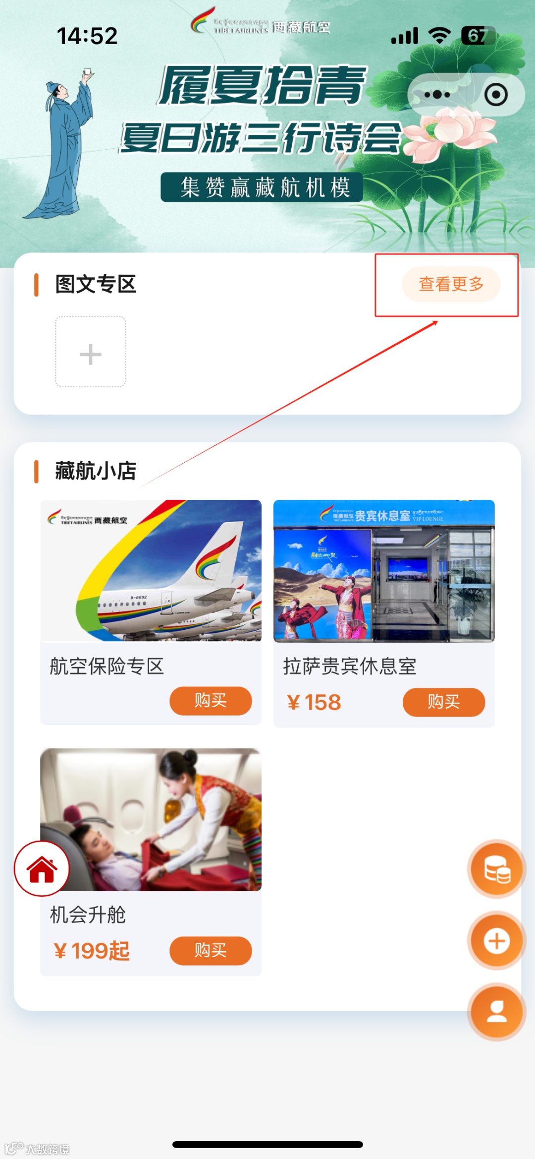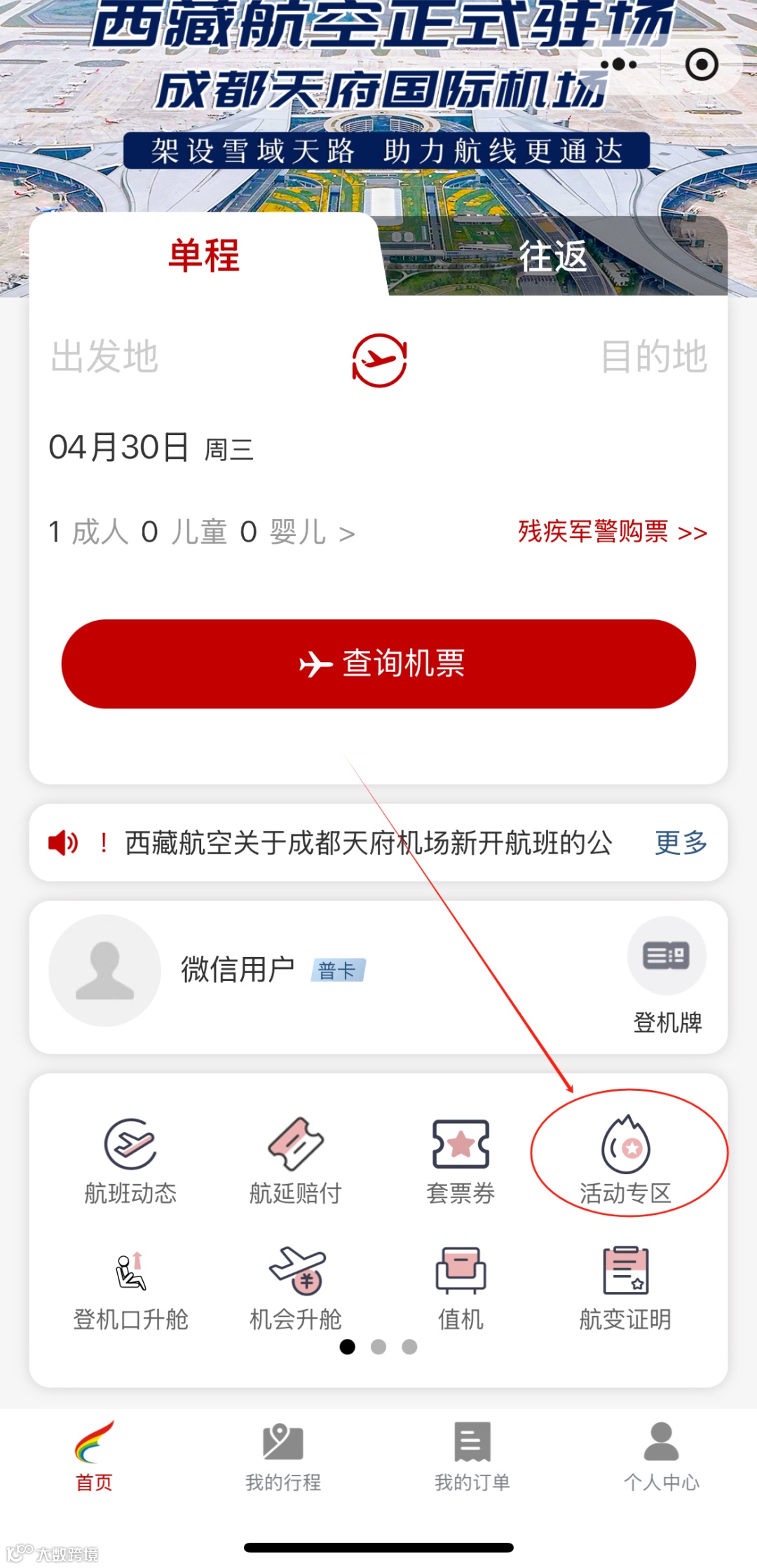 1.进入【西藏航空微信小程序】- 点击活动专区;