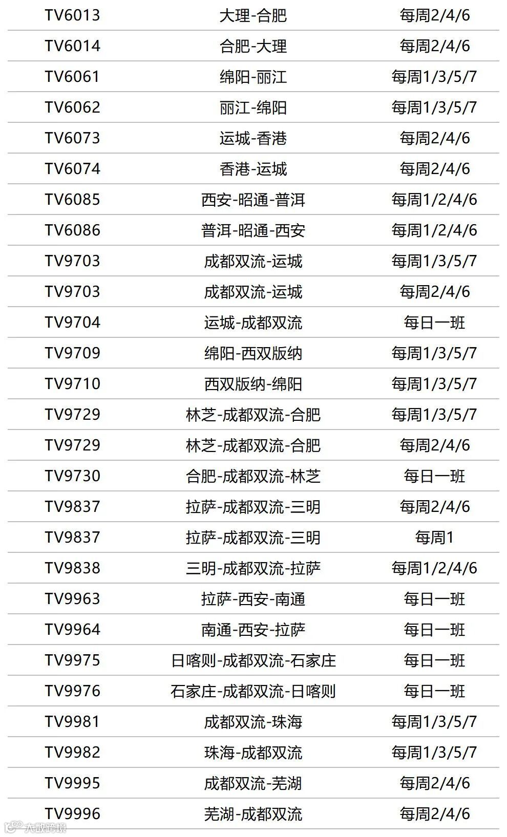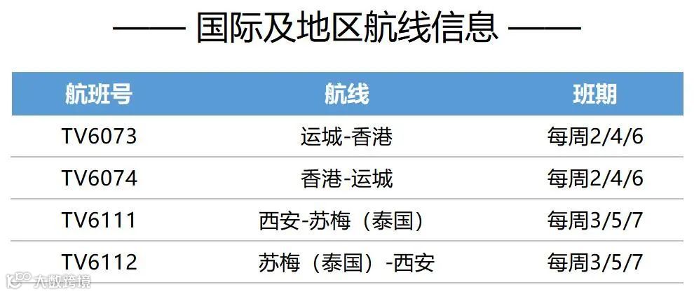 新开运城=香港为西藏航空首条地区性航线,计划13:10自运城起飞16:25抵达香港,18:15从香港起飞21:00返回运城,每周二、四、六各执行一班。