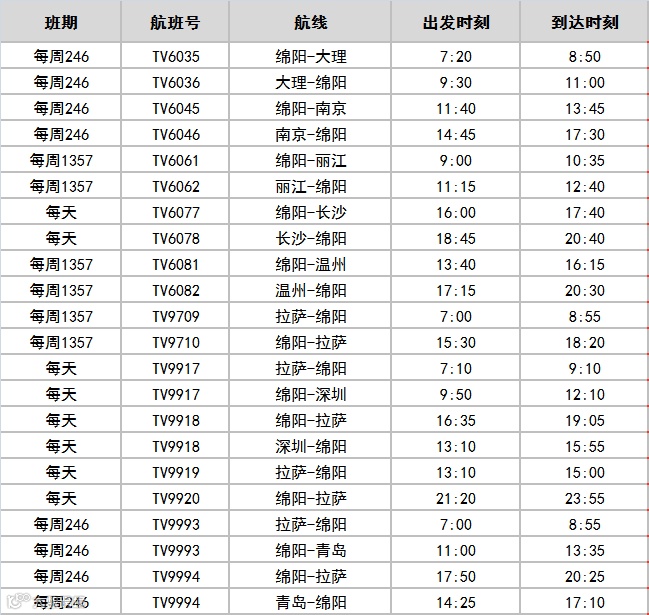 2024年冬航季西藏航空绵阳航线时刻