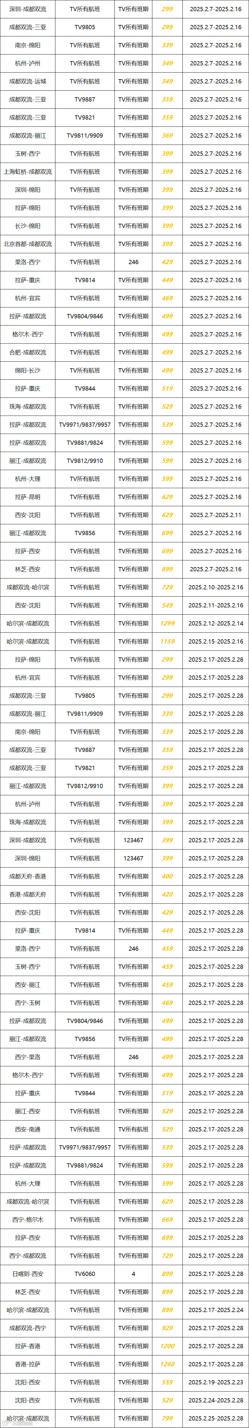 *预付费行李产品价格以西藏航空销售渠道实际显示为准。