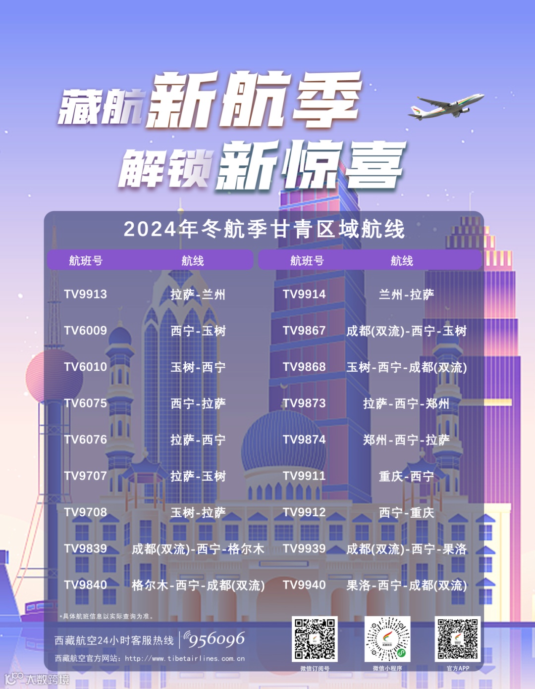 西藏航空2024年冬航季