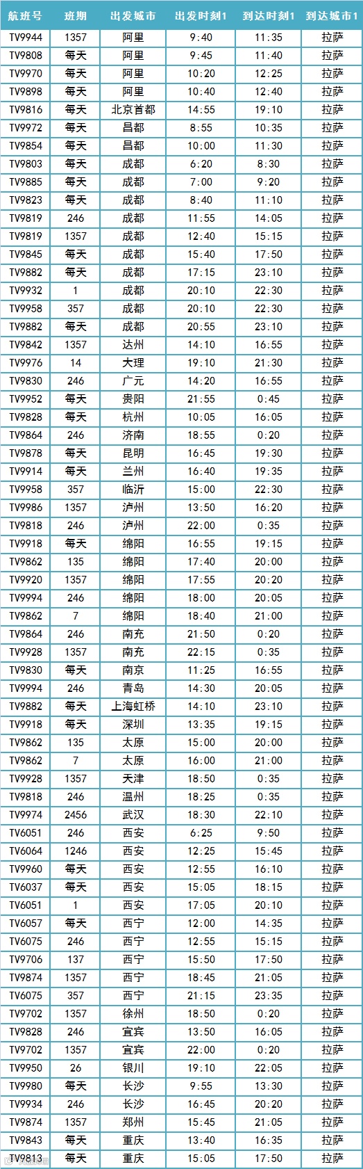 拉萨进出港航班时刻
