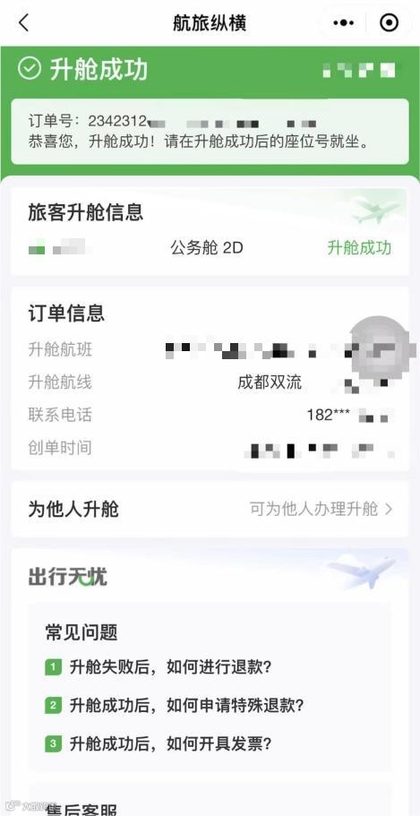 请您于生成订单后尽快完成支付,超出时间订单自动取消。若升舱失败,系统将自动退款至您的原支付账户。