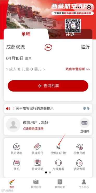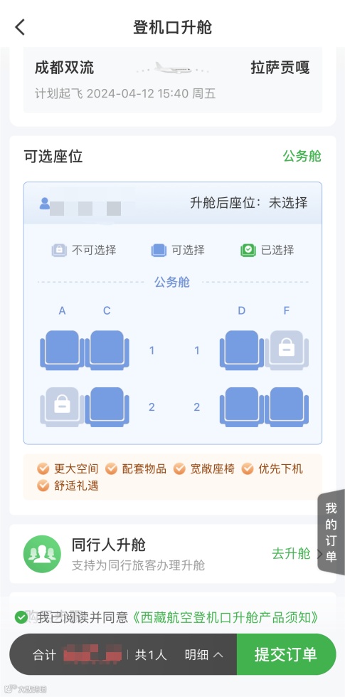 西藏航空官方微信小程序“登机口升舱”入口进入付费升舱页面;