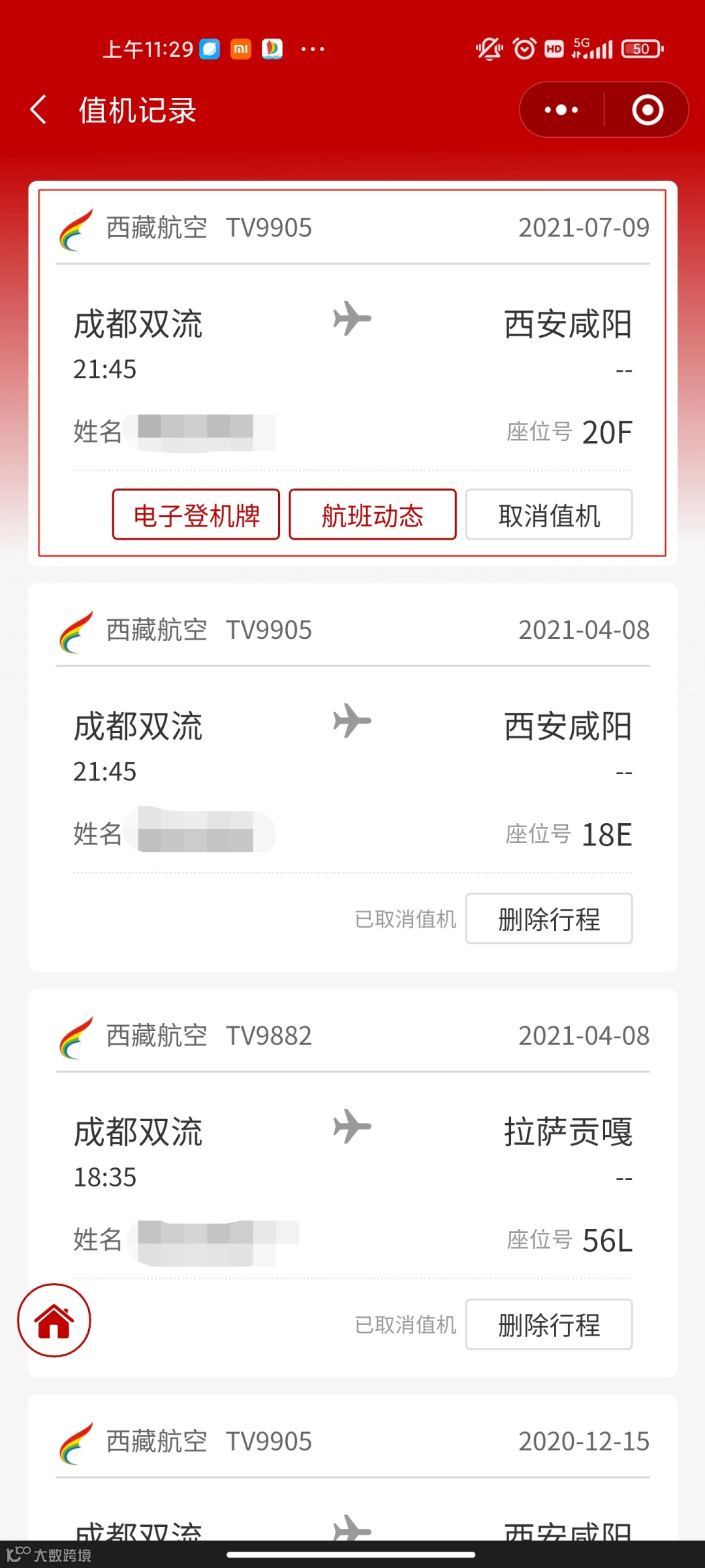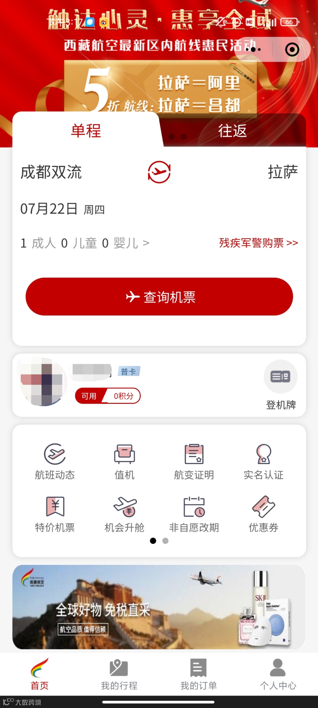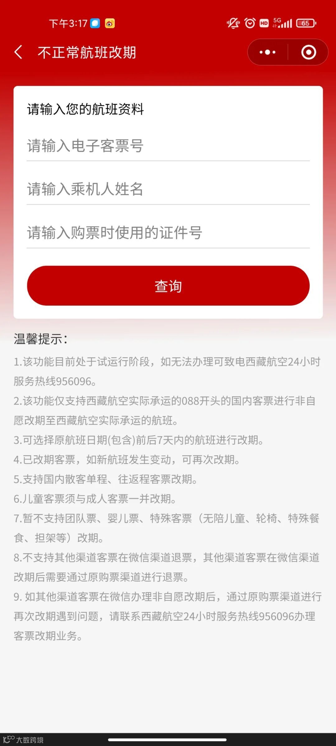 西藏航空推出了微信小程序自助服务