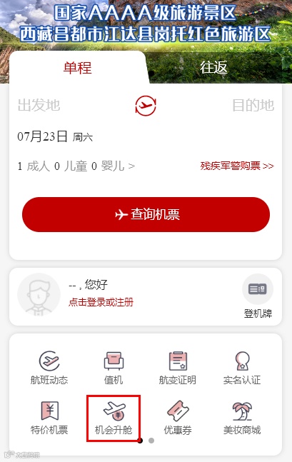 西藏航空微信小程序-“首页”-“机会升舱”