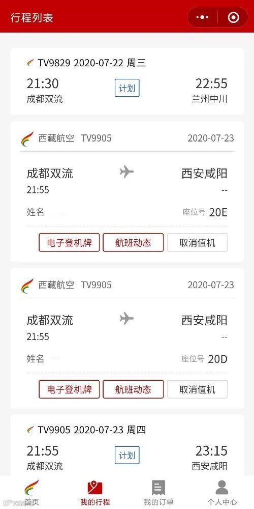 为旅客行程或关注航班信息。分别为:购票航班、航班动态关注航班、值机航班、扫码登机牌关注航班。根据不同类型、提供查看航班动态、值机、查看电子登机牌等功能。