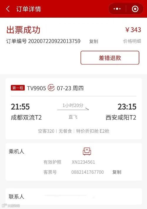 旅客可以查看机票订单信息,主要包括订单信息:订单状态、订单编号、订单总额;航班信息:航班号、航班日期、计划起飞时间、计划到达时间、出发城市机场、到达城市机场、飞行时长、经停/直飞、经停城市、是否有餐食、机型、舱位名称、舱位标识、票价使用条件、去程/返程标识;乘机人信息:姓名、证件号、客票号。并提供改升、退票、差错退款等功能。
