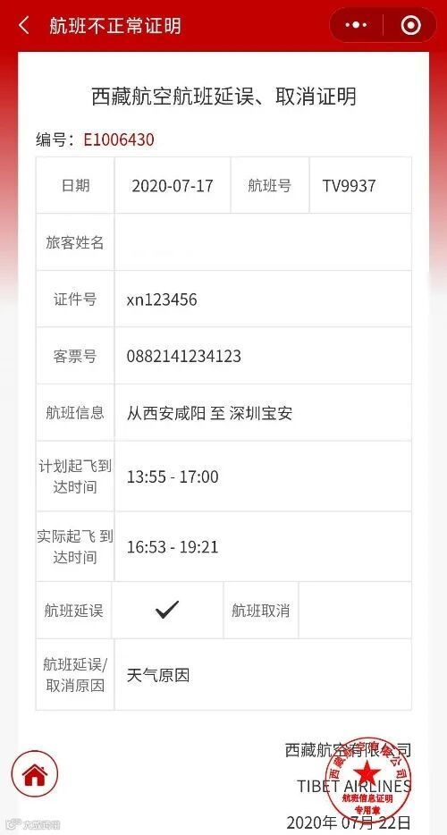 航班发生延误或取消时,旅客可以在线获取电子版航班延误/取消证明。输入航班号、航班日期、旅客证件号或客票号,通过证件号验证旅客是否乘坐该航班。已有航延编号可直接验证15位纯数字航延编号。对接西藏航空FOC系统验证航班是否发生延误或取消,验证通过后,符合条件的可自主向旅客开具电子版航班延误/取消证明。