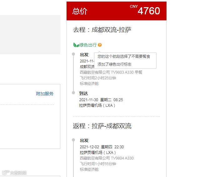 西藏航空推出“绿色出行,按需用餐”活动!