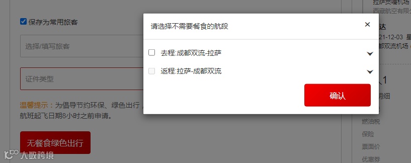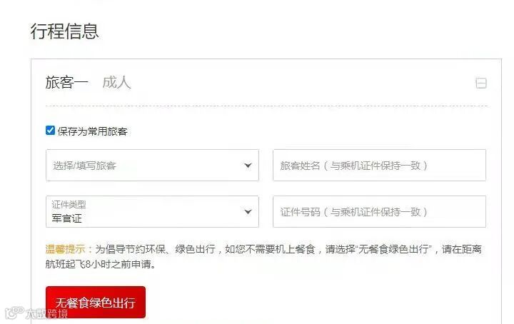 游客填完行程信息后,如不需要机上餐食,可点击下发的“无餐食绿色出行”。