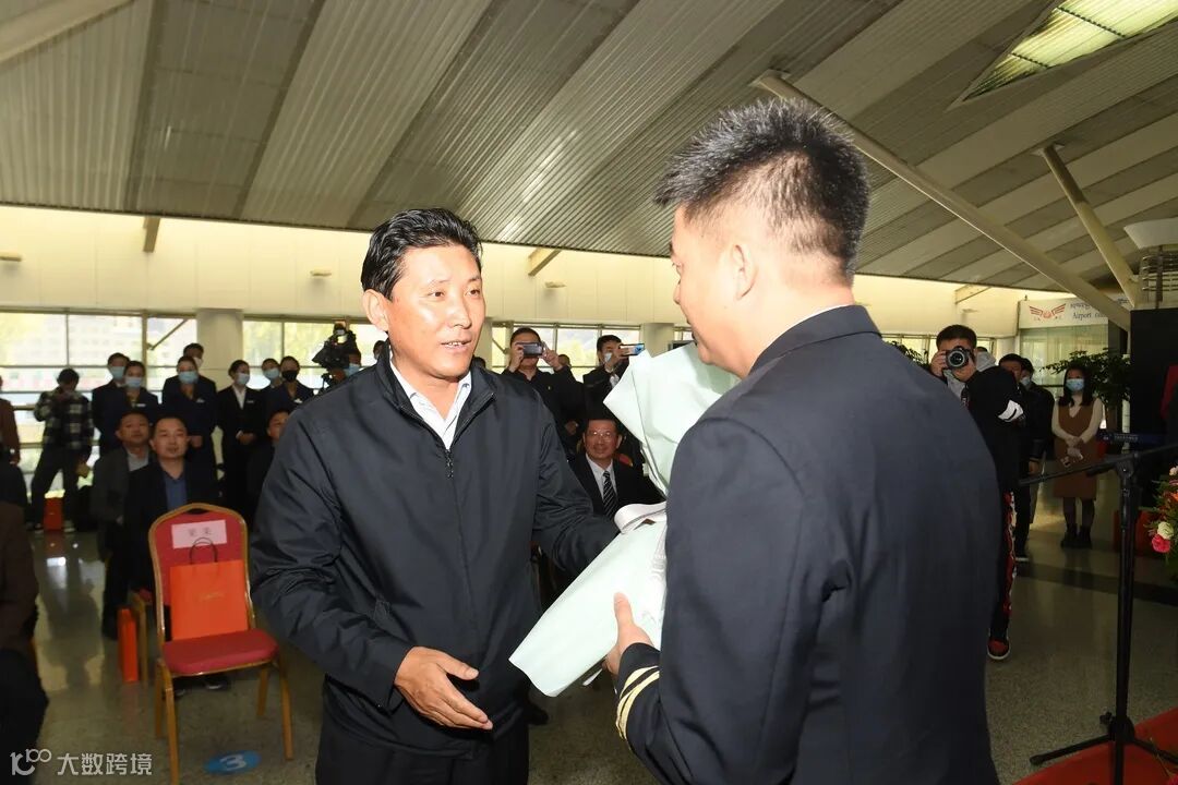 拉萨市委副书记、市长果果为首航机组献上鲜花