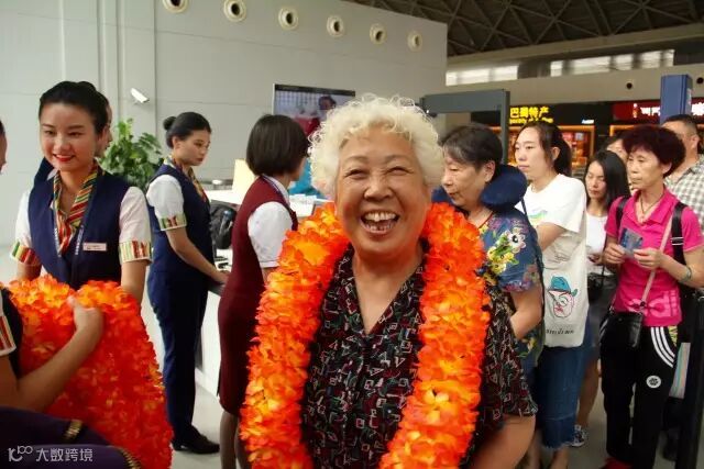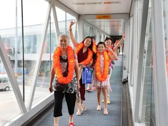 旅客们戴着地服人员献上的欢迎花环登机
