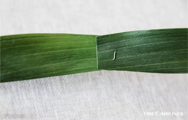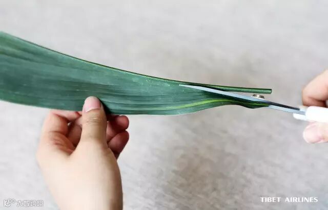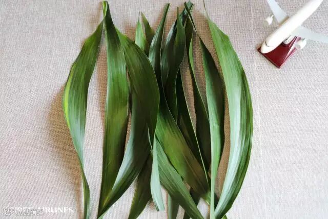 先将粽叶沿叶茎剪成两片,去掉材质较硬的叶茎部分
