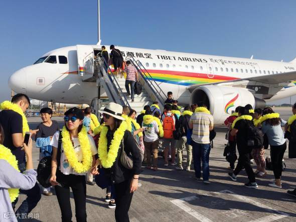 工作人员就为每位旅客戴上了欢迎花环