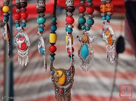 银、珊瑚、绿松石雕镂而成的藏饰。