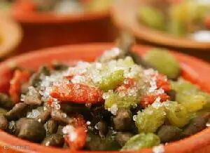 人参果米饭是藏餐中的佳品。先把从草原上挖出的被称为人参果的蕨麻用清水洗净煮熟,再把米饭煮熟,加进人参果,放上白糖、葡萄干,淋上溶化了的酥油,拌着火锅吃怎一个香字了得!