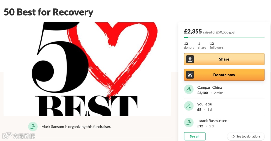 *为应对新冠危机及其对餐饮业的影响,全球50佳酒吧和餐厅发起了50 Best for Recovery项目,筹集的每一分钱将以直接赠款和慈善捐款的形式提供给酒吧和餐厅。