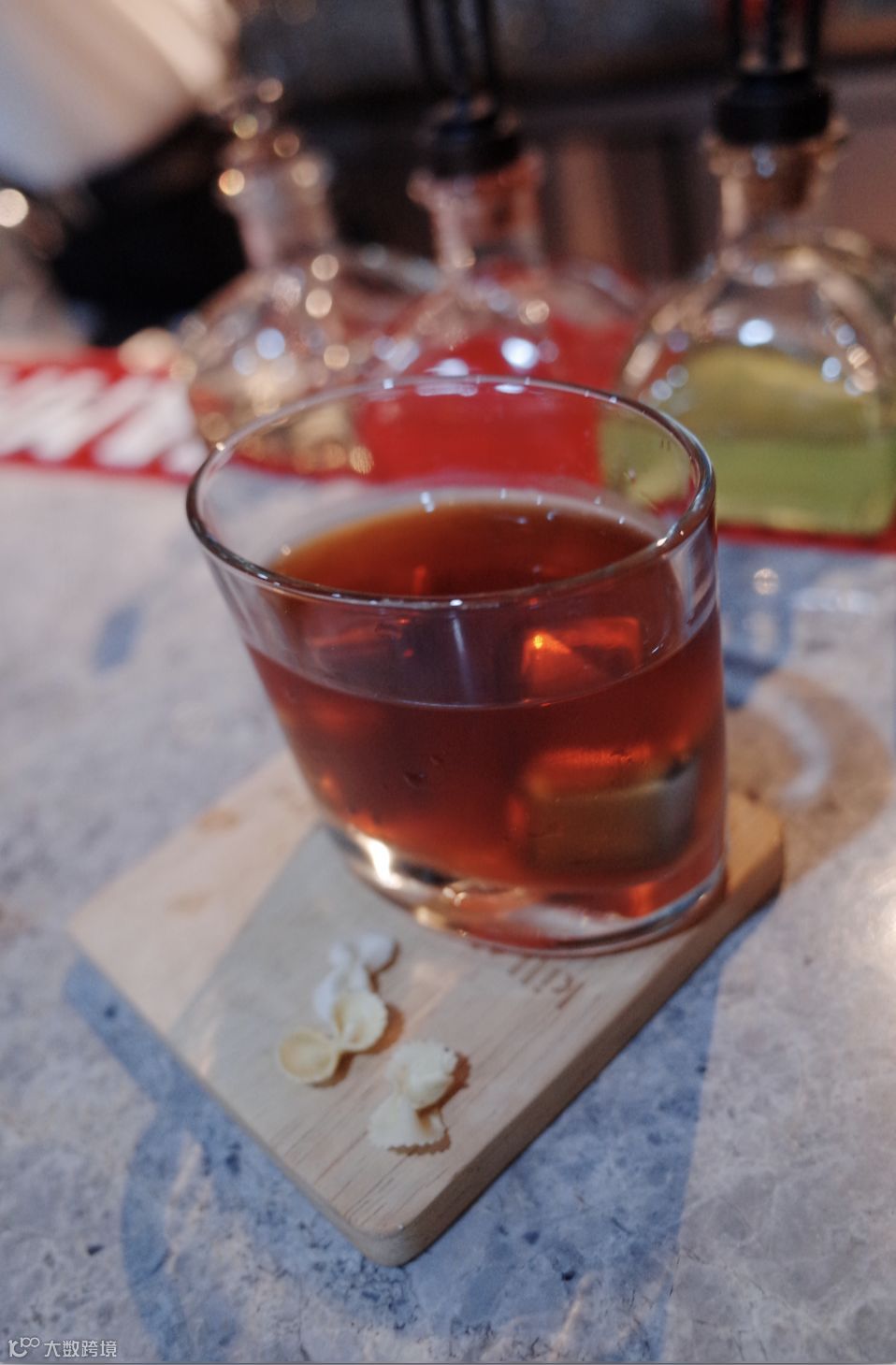 除了酒本身,MISH的每一处细节也致敬了那个特定时代语境下的经典人物,煮熟烘干的蝴蝶面,意向表达那时候的西装配领结的海派形象;扁圆形的杯子,就像当时老克勒们随身携带的酒壶,作为接受外来文化的本地人,他们钟爱自己的黄酒,也青睐国外的洋酒。