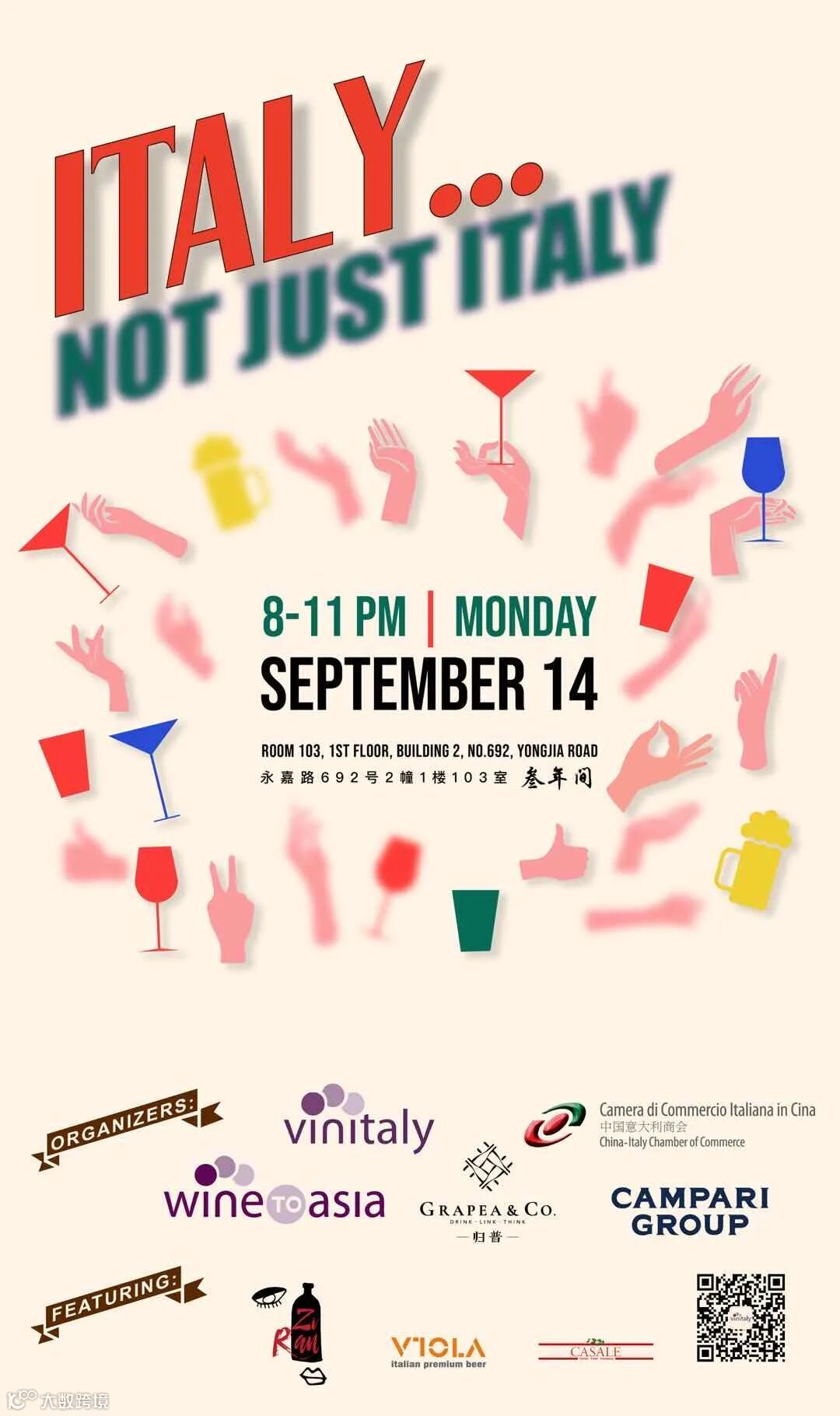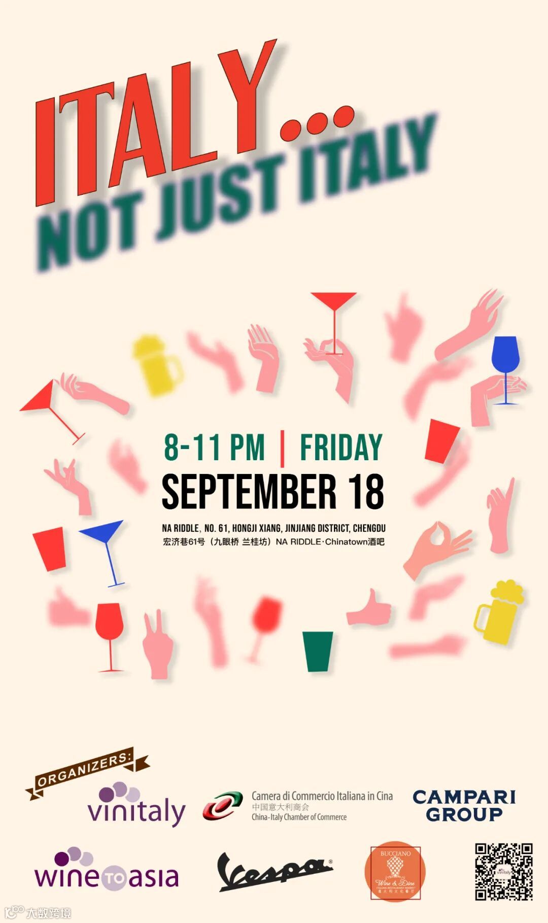 与上海站一样,在路演结束后,18日晚20:00-23:00,我们还在Na Riddle(成都市锦江区宏济巷61号)为大家准备了一场展后派对。展后派对将对路演展商和中国意大利商会成员限时免费开放,第一个小时(20:00-21:00)畅饮畅食,之后的两个小时,买一送一。