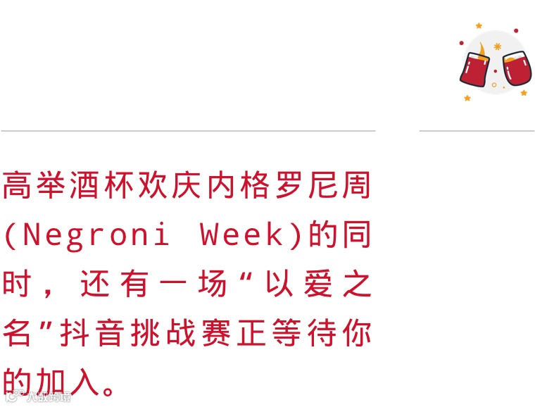 这项线上挑战邀请中国调酒师与酒吧团队加入其中,以抖音视频分享的方式,传达出自己对于内格罗尼的喜爱,并用这份热情回馈酒吧行业,让爱意延续。