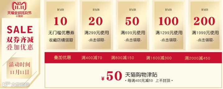 介绍完清单,别忘了还有优惠券。除了天猫的满400减50上不封顶购物津贴外,还有10元无门槛优惠券,满299-20元,699-50元等多种优惠组合,叠加使用更划算哦。