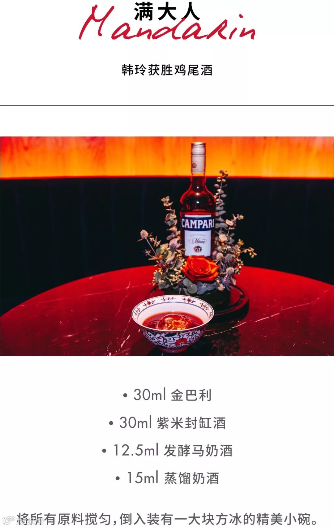 韩玲的故事告诉我们,世界各地的酒其实也是文化沟通的桥梁,不同元素的结合会产生出美妙的新事物。她的这款满大人通过使用发酵马奶酒和蒸馏奶酒,带来了游牧民族的风味,与金巴利的碰撞更是创造出值得玩味的和谐(欢迎在文末查看这款冠军鸡尾酒的配方)。