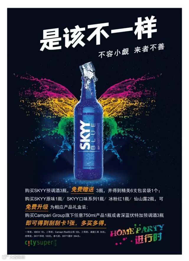 1)购买SKYY预调酒3瓶,免费赠送3瓶,并得到精美6支包装袋1个;