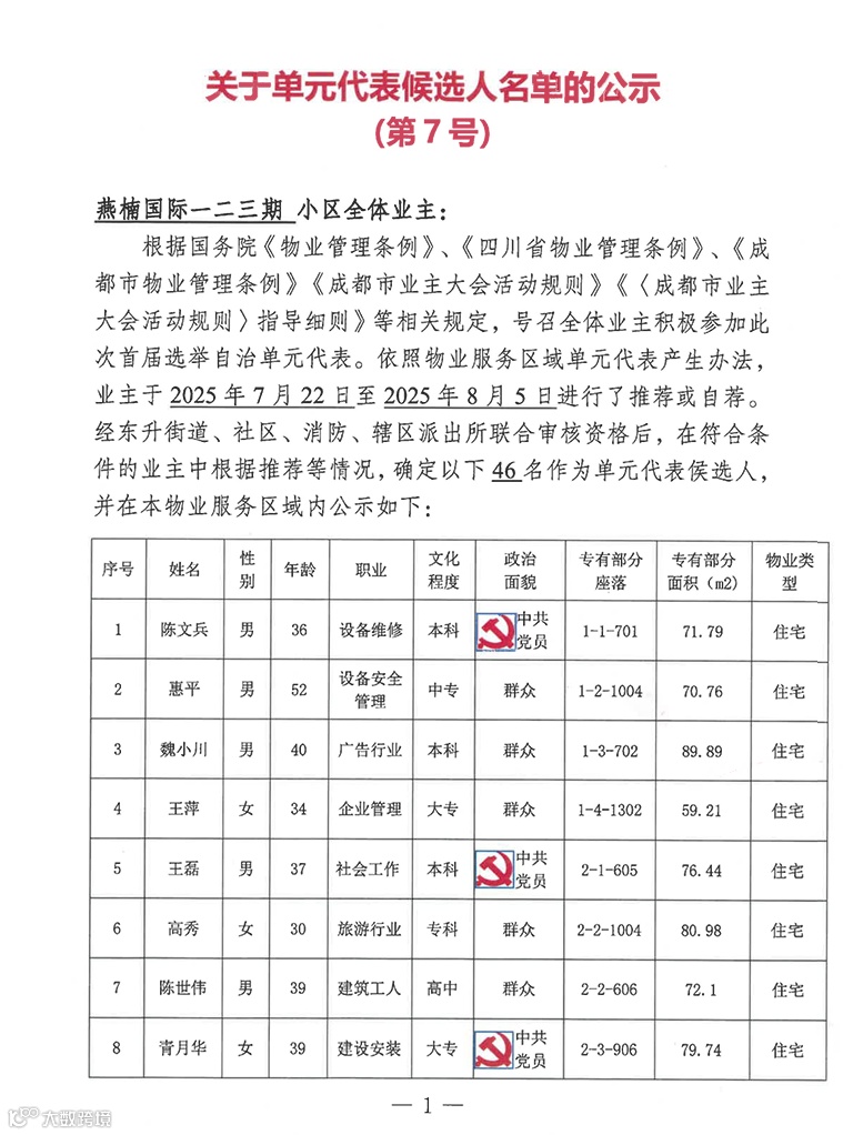 1、发布7号公示文件《关于单元代表候选人名单的公示》;