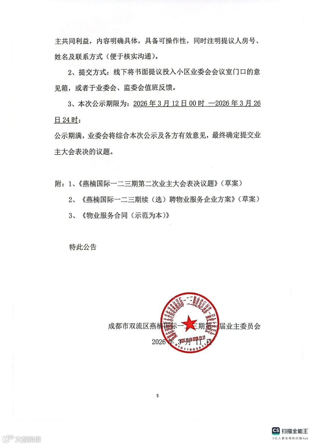 关于燕楠国际一二三期第二次业主大会议题的公告