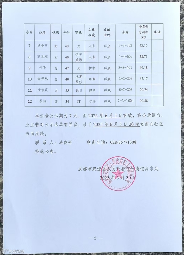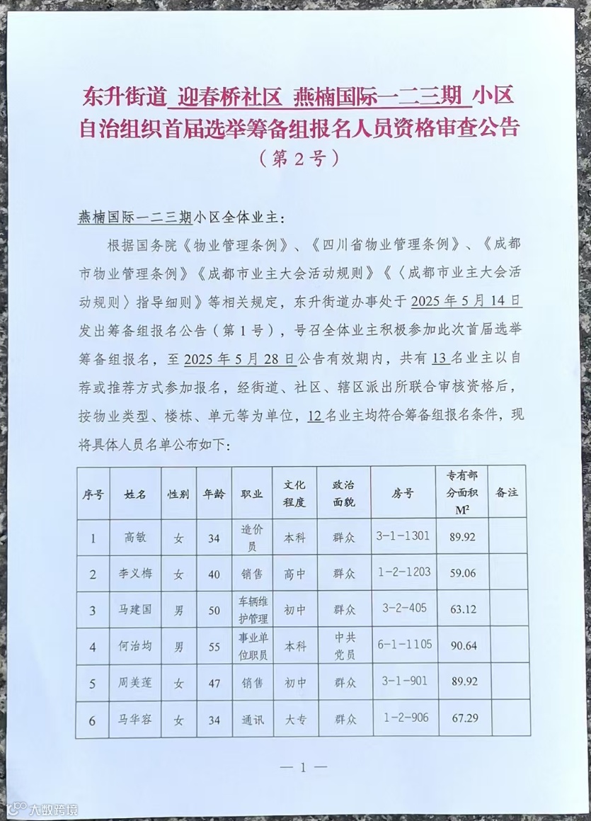 现将东升街道迎春桥社区燕楠国际一二三期小区自治组织首届选举筹备组报名人员资格审查公告 2 号公示如下,详见附件。